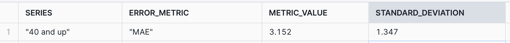 The results include separate evaluation metrics for both age bins we provided to the model. The results also list out various metrics we can use to understand our model’s performance. We’ll look at MAPE and Mean Absolute Error, which represents the average absolute error between actual and predicted values. At a high level, we can interpret this as a representation of how accurate the model’s predictions will be. The lower the better.