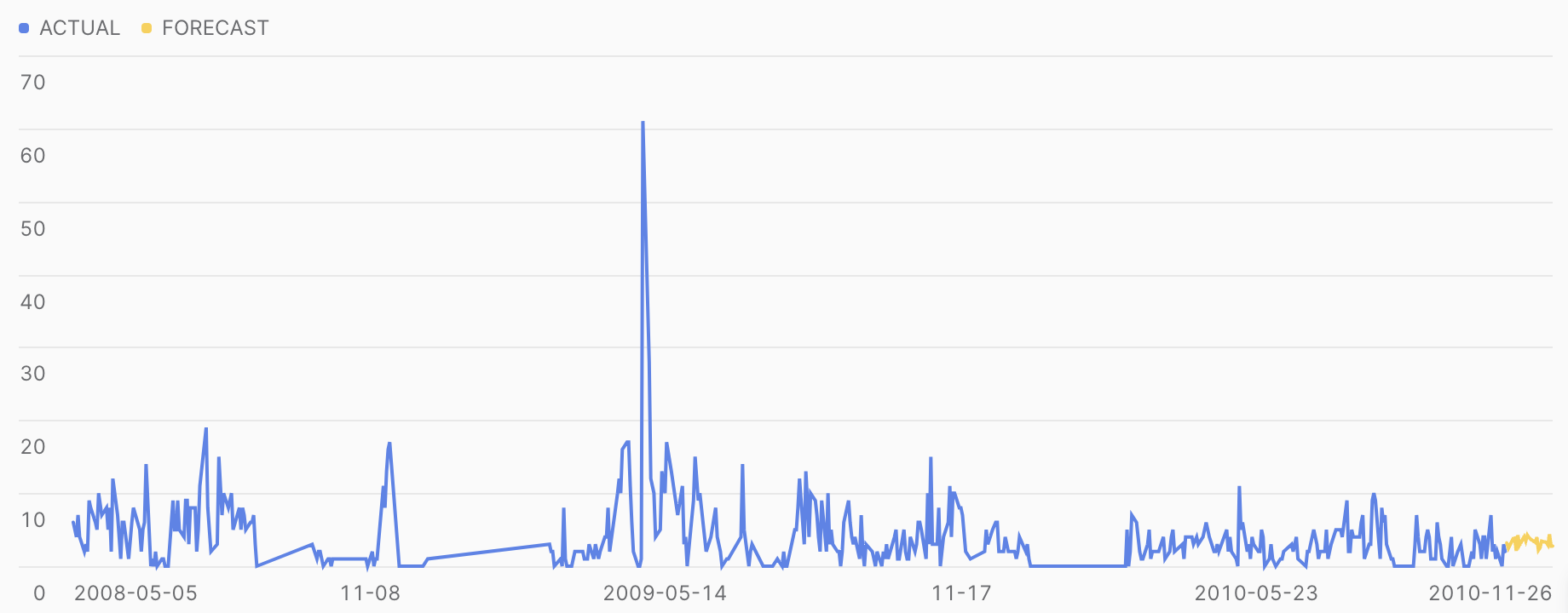 Run the above SQL then click on “Chart” in the results pane. Be sure to add FORECAST as a variable and set “Aggregation” to “None” for both ACTUAL and FORECAST.