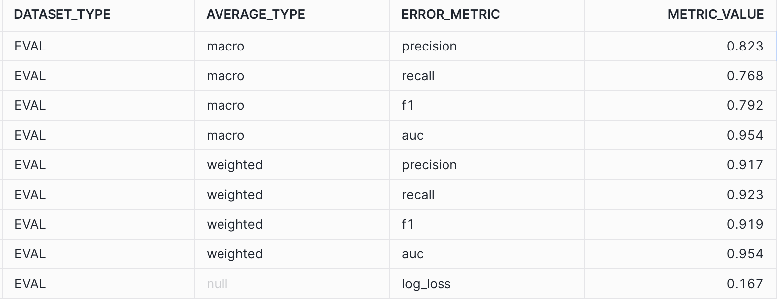 This image above calculates the overall precision, recall, f1, and AUC across all the classes (i.e the GLOBAL_EVALUATION_METRICS). In the case that you are working on a multi-class problem with more than two classes, looking at the SHOW_EVALUATION_METRICS will give you a better sense of how good the model is at predicting each one of the classes. A higher number here (i.e closer to 1) means that the model is more predictive of the outcomes.
