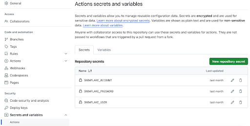 In order for your GitHub Actions workflow to connect to your Snowflake account you will need to store your Snowflake credentials in GitHub. Action Secrets in GitHub are used to securely store values/variables for use in CI/CD pipelines.