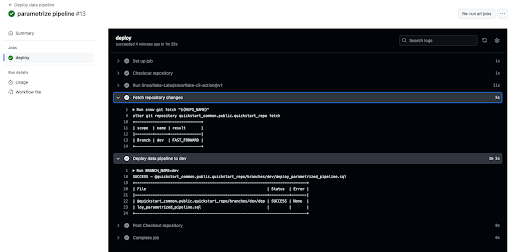 - From the run overview page click on the “deploy” job and browse through the output from the various steps. In particular you might want to review the output of the “Deploy data pipeline to dev” step.