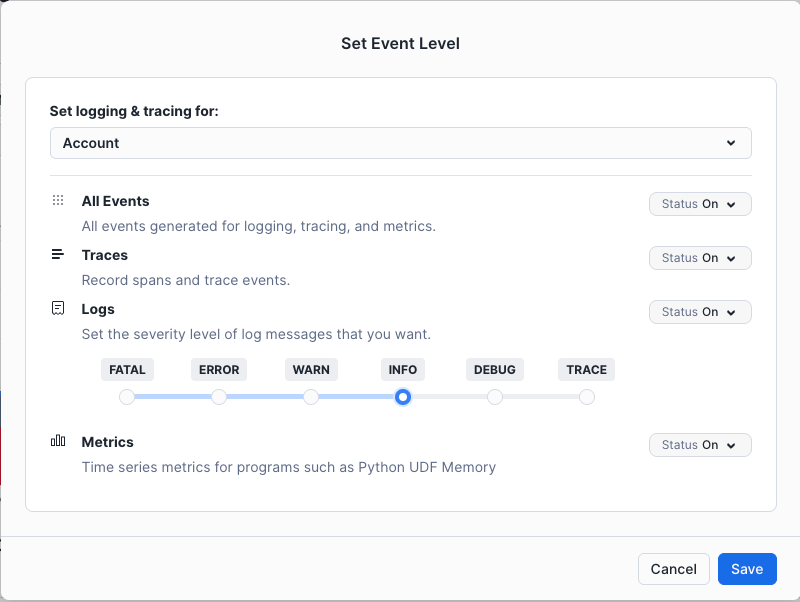-- Switch to ACCOUNTADMIN USE ROLE ACCOUNTADMIN; -- Set account level values ALTER ACCOUNT SET LOG_LEVEL = 'INFO'; ALTER ACCOUNT SET METRIC_LEVEL = 'ALL'; ALTER ACCOUNT SET TRACE_LEVEL = 'ALWAYS';