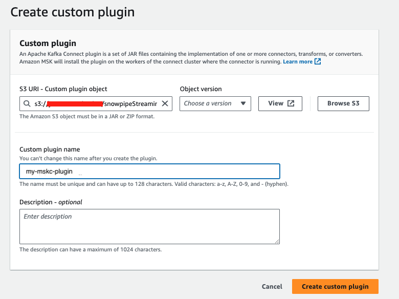 Fill in the s3 path to your uploaded zip file, e.g. s3://my-mskc-bucket/snowpipeStreaming-mskc-plugins.zip