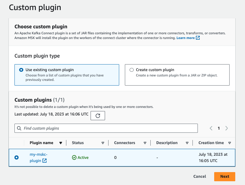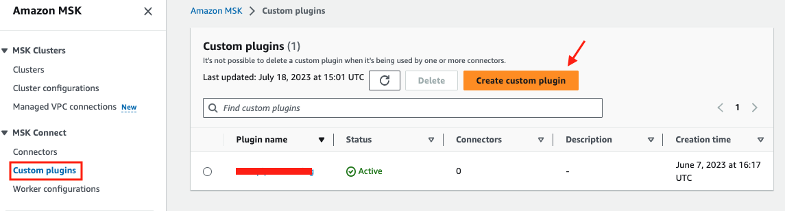 Give the custom plugin a name, e.g. my-mskc-plugin, click Create custom plugin.