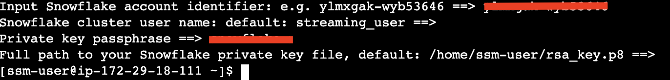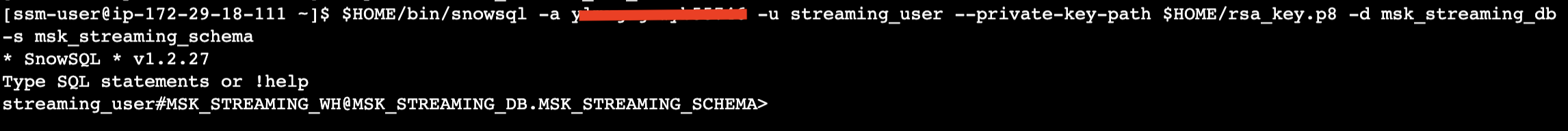 passwd=changeit # Use the default password for the Java keystore, you should change it after finishing the lab directory=/home/ssm-user/snowpipe-streaming # Installation directory cd $HOME mkdir -p $directory cd $directory pwd=`pwd` sudo yum clean all sudo yum -y install openssl vim-common java-1.8.0-openjdk-devel.x86_64 gzip tar jq python3-pip wget https://archive.apache.org/dist/kafka/2.8.1/kafka_2.12-2.8.1.tgz tar xvfz kafka_2.12-2.8.1.tgz -C $pwd wget https://github.com/aws/aws-msk-iam-auth/releases/download/v1.1.1/aws-msk-iam-auth-1.1.1-all.jar -O $pwd/kafka_2.12-2.8.1/libs/aws-msk-iam-auth-1.1.1-all.jar rm -rf $pwd/kafka_2.12-2.8.1.tgz cd /tmp && cp /usr/lib/jvm/java-openjdk/jre/lib/security/cacerts kafka.client.truststore.jks cd /tmp && keytool -genkey -keystore kafka.client.keystore.jks -validity 300 -storepass $passwd -keypass $passwd -dname "CN=snowflake.com" -alias snowflake -storetype pkcs12 #Snowflake kafka connector, must be v3.0.0 or later for Iceberg support, here we use v3.1.0 wget https://repo1.maven.org/maven2/com/snowflake/snowflake-kafka-connector/3.1.0/snowflake-kafka-connector-3.1.0.jar -O $pwd/kafka_2.12-2.8.1/libs/snowflake-kafka-connector-3.1.0.jar wget https://repo1.maven.org/maven2/org/bouncycastle/bc-fips/1.0.1/bc-fips-1.0.1.jar -O $pwd/kafka_2.12-2.8.1/libs/bc-fips-1.0.1.jar wget https://repo1.maven.org/maven2/org/bouncycastle/bcpkix-fips/1.0.3/bcpkix-fips-1.0.3.jar -O $pwd/kafka_2.12-2.8.1/libs/bcpkix-fips-1.0.3.jar