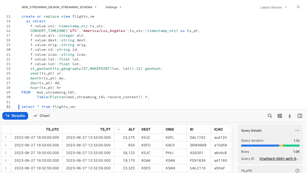 You can now go back to the Snowflake worksheet to run a select count(1) from flights_vw query every 10 seconds to verify that the row counts is indeed increasing.