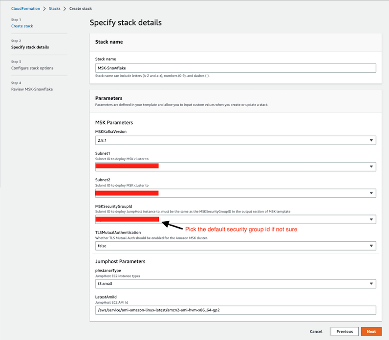 using the default security group in your VPC, if you do not have the default security group, create one on your own before moving forward. Leave TLSMutualAuthentication as false and the jumphost instance type and AMI id as default before clicking