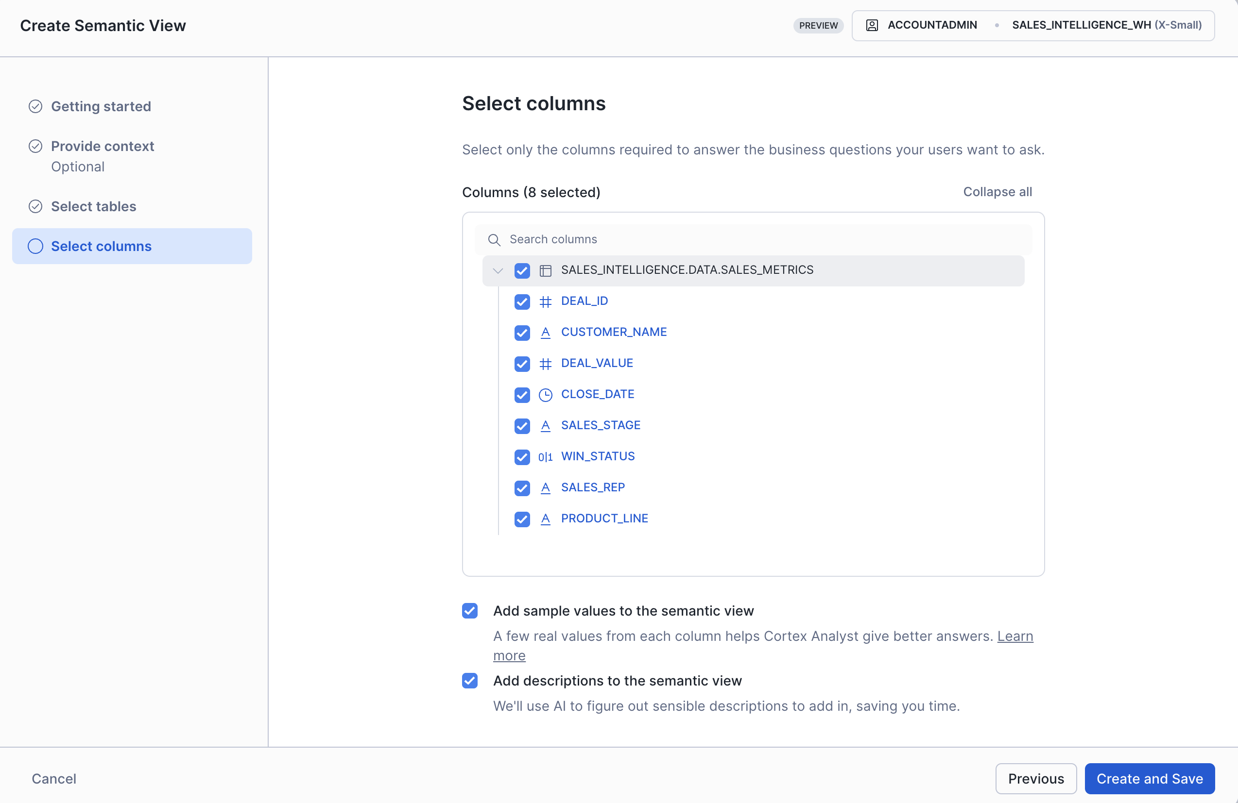 ☑️ Add descriptions to the semantic view - Select Create and Save.