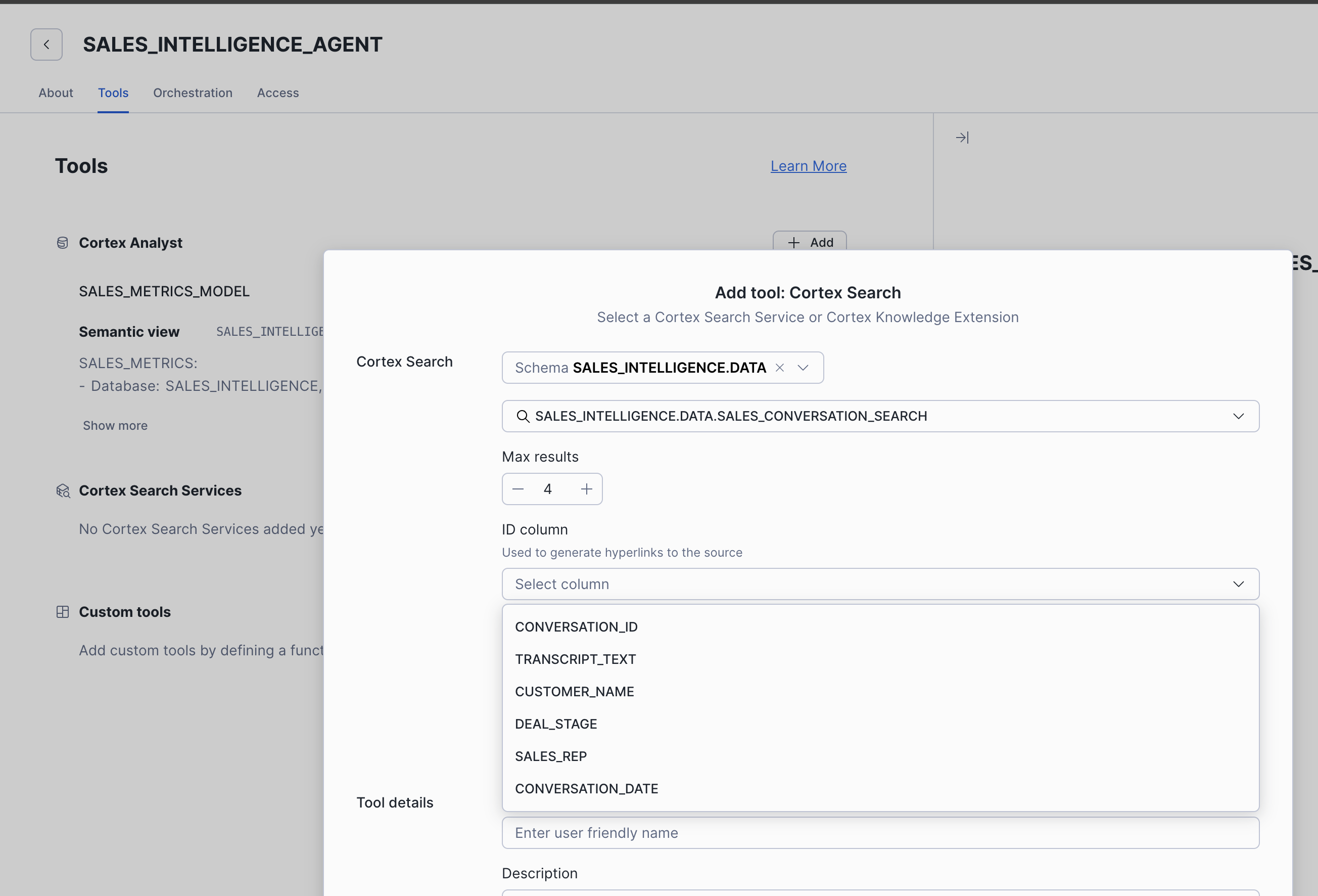 SALES_INTELLIGENCE.DATADatabase and Schema. - Select Create Agent.