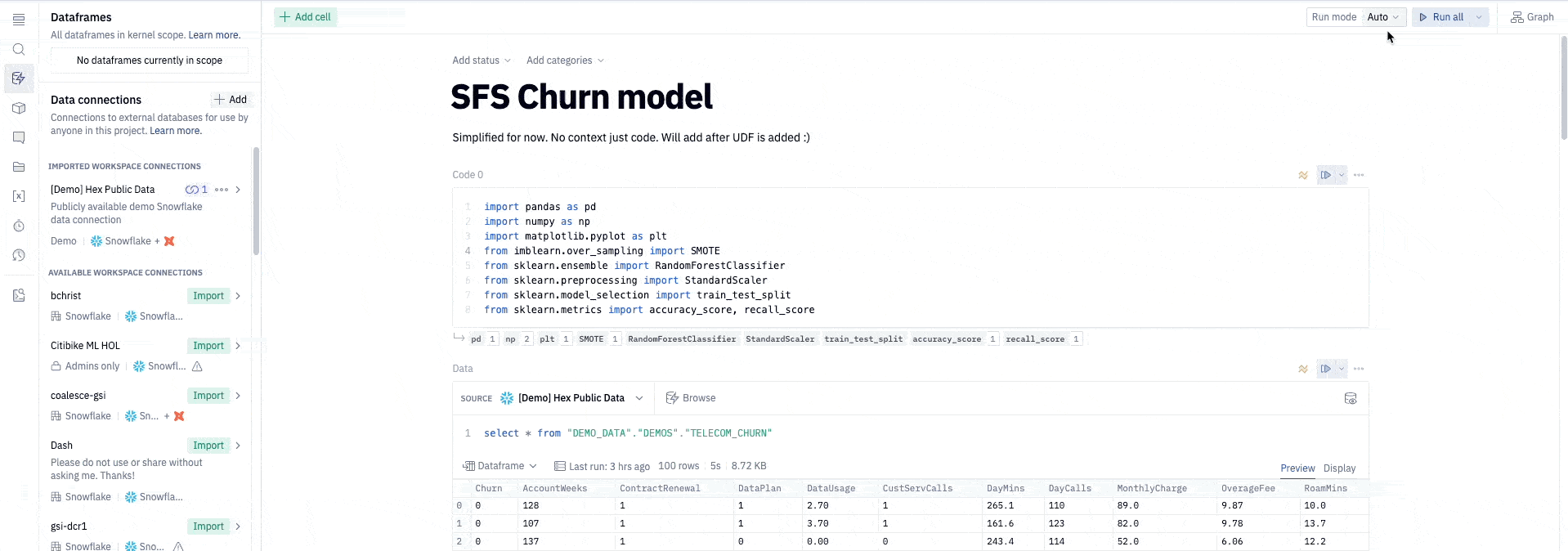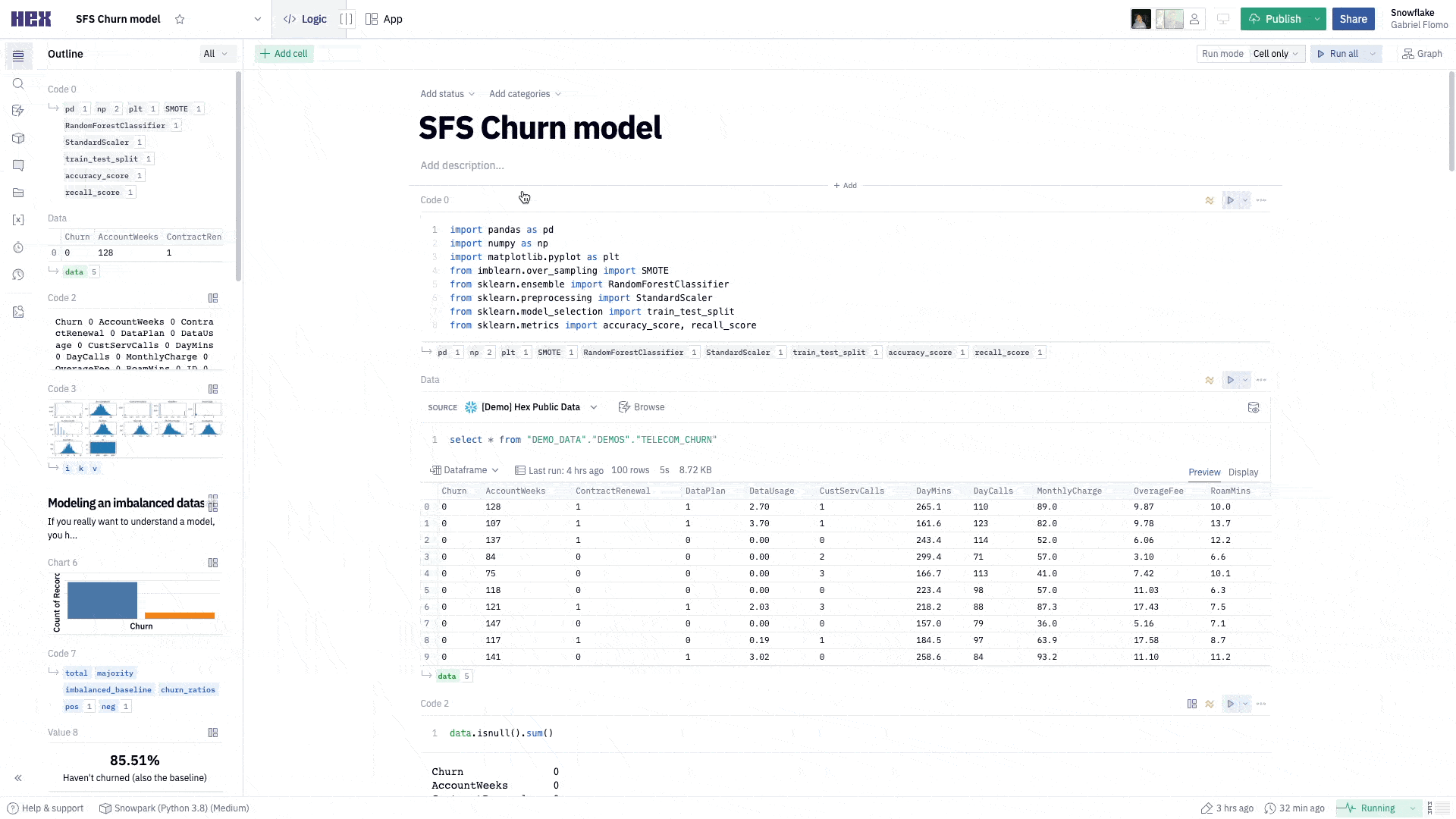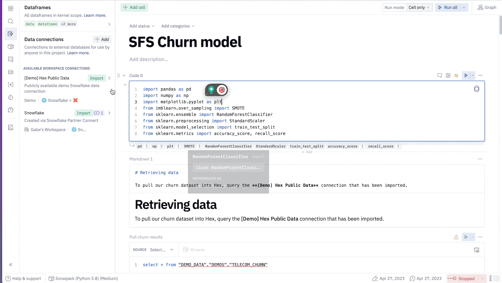 In this Quickstart guide, we will play the role of a data scientist at a telecom company that wants to identify users who are at high risk of churning. To accomplish this, we need to build a model that can learn how to identify such users. We will demonstrate how to use Hex in conjunction with Snowflake/Snowpark to build a Random Forest Classifier to help us with this task.