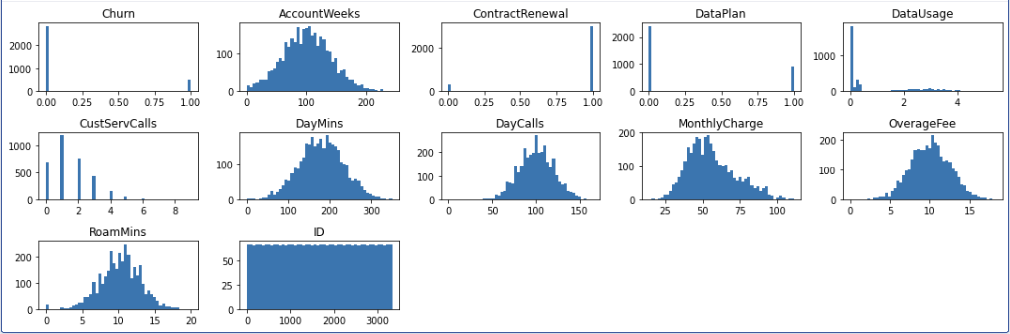 The charts' results allow us to visualize each variables distribution, which can help us identify early signs of skewness, among other things. We can see that all of our continuous variables follow a fairly normal distribution, and further transformations won't be necessary. The DataUsage column appears a little off because many customers use 0GB of data, but there are also a lot of users who didn't have data plans in the first place, so this isn't considered an anomaly.