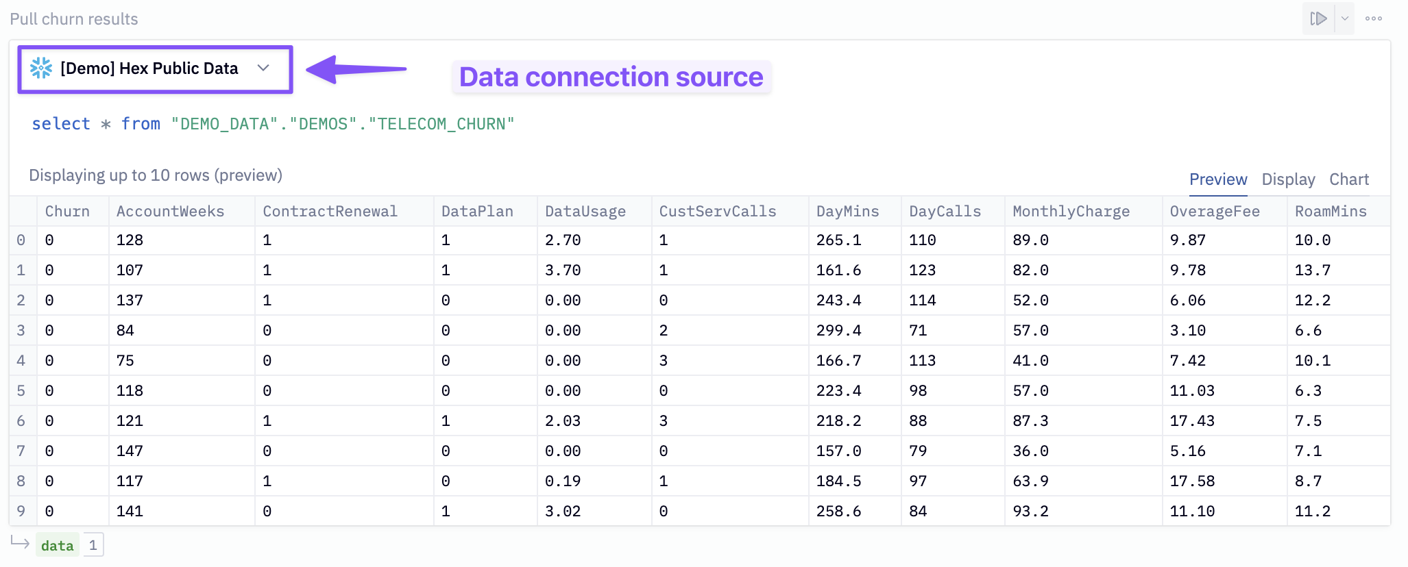 To predict customer churn, we first need data to train our model. In the SQL cell labeled Pull churn results assign [Demo] Hex public data as the data connection source and run the cell.