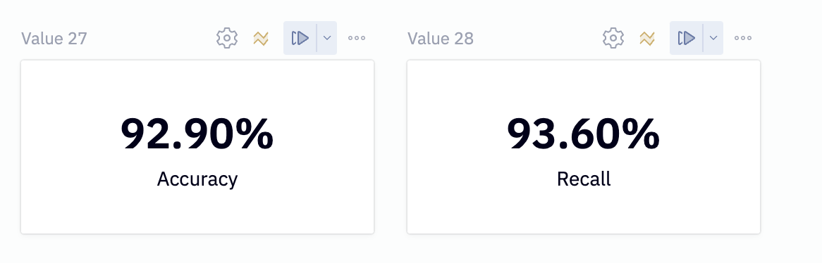 This will calculate an accuracy and recall score for us which we'll display in a single value cell.