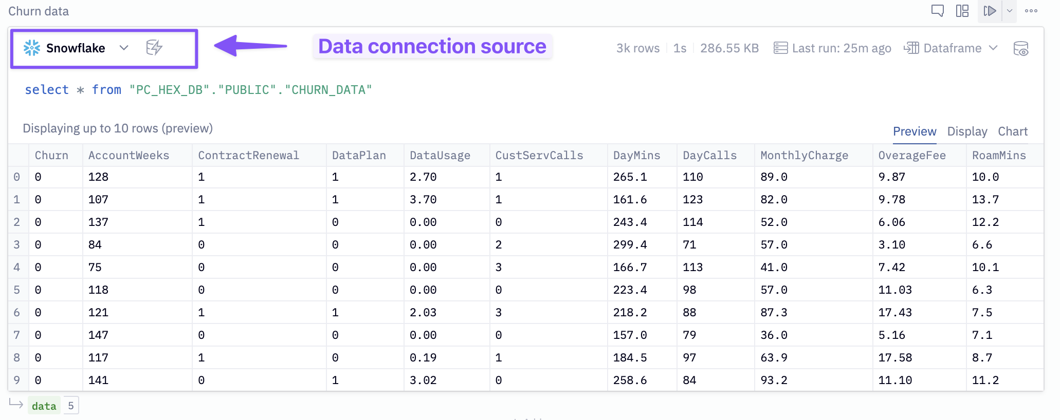 In the SQL cell labeled Churn data, change the data source to Snowflake and execute the cell. You will see a green output variable named data at the bottom.