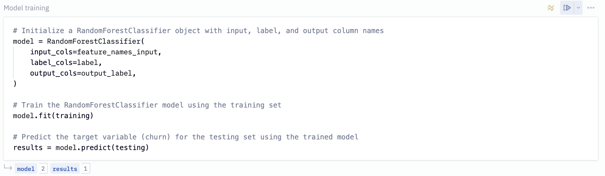 # Initialize a RandomForestClassifier object with input, label, and output column names model = RandomForestClassifier( input_cols=feature_names_input, label_cols=label, output_cols=output_label, ) # Train the RandomForestClassifier model using the training set model.fit(training) # Predict the target variable (churn) for the testing set using the trained model results = model.predict(testing)