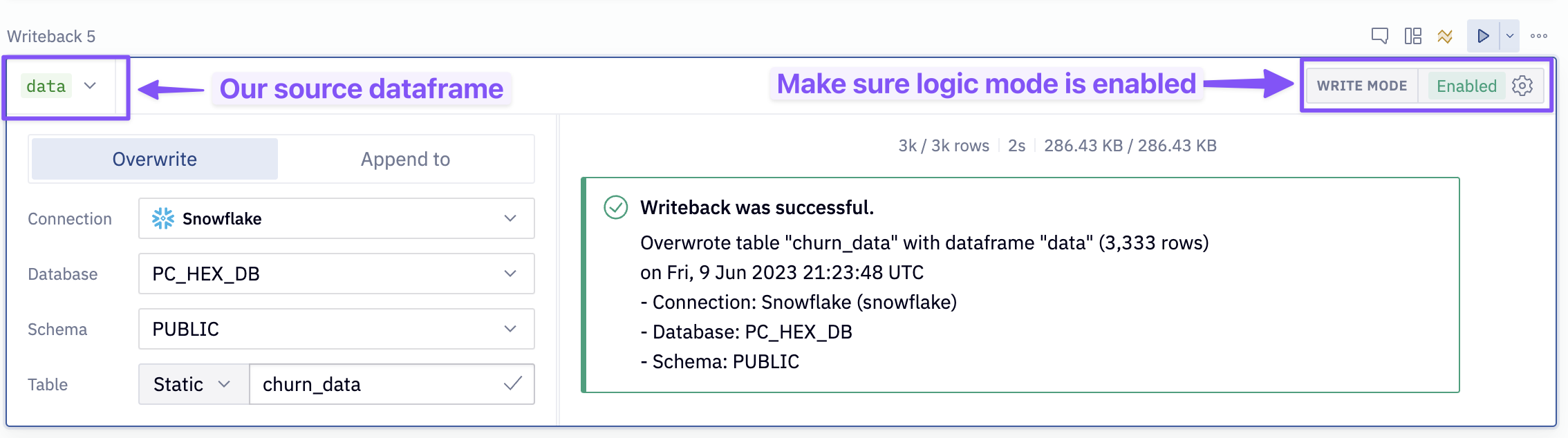 At the bottom of this cell, you will see a green output variable labeled data. This is a Pandas dataframe, and we are going to write it back into our Snowflake data connection. To do so, input the following configurations to the writeback cell (labeled: Writeback to snowflake)
