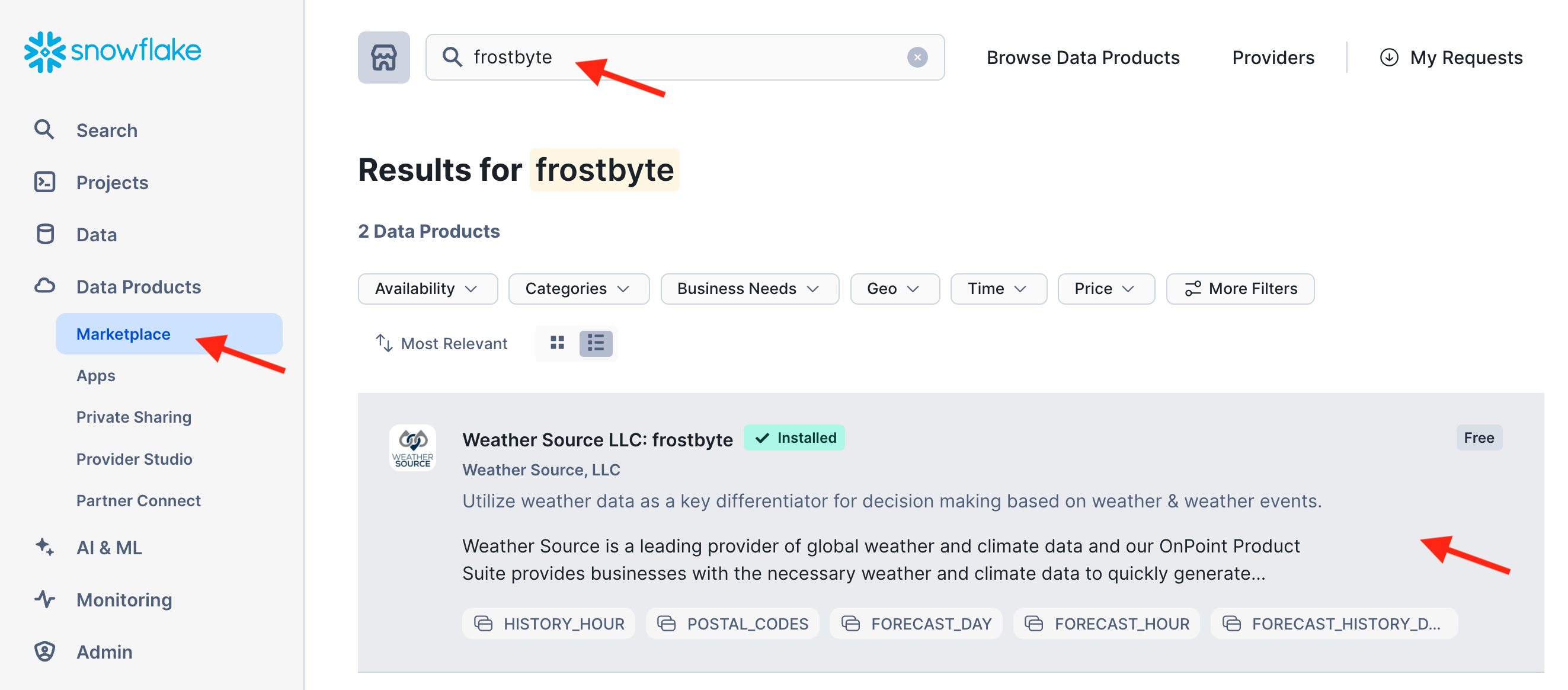 Weather Source LLC: frostbyte Marketplace listing requires accepting terms of use by the Provider and Snowflake.