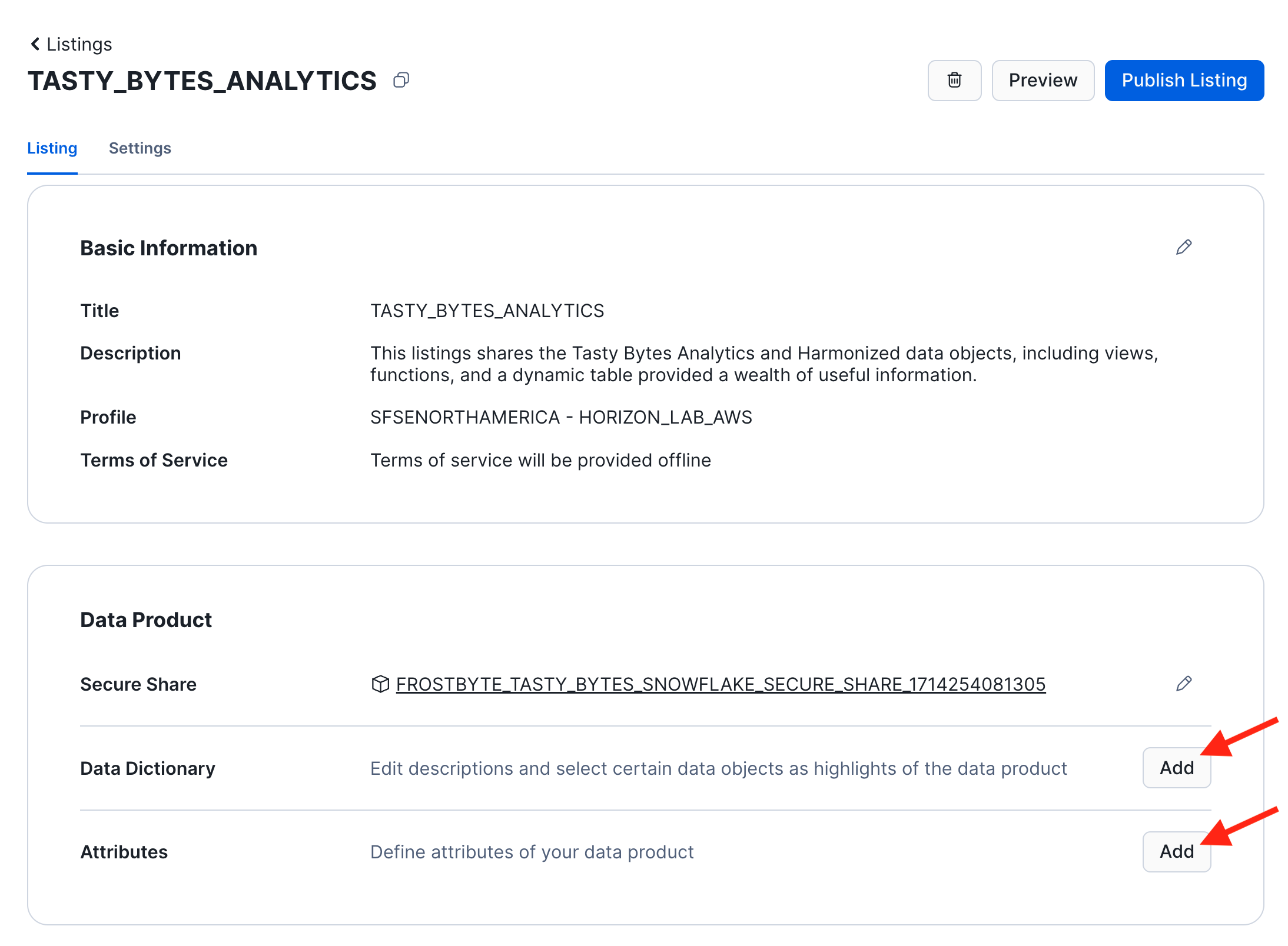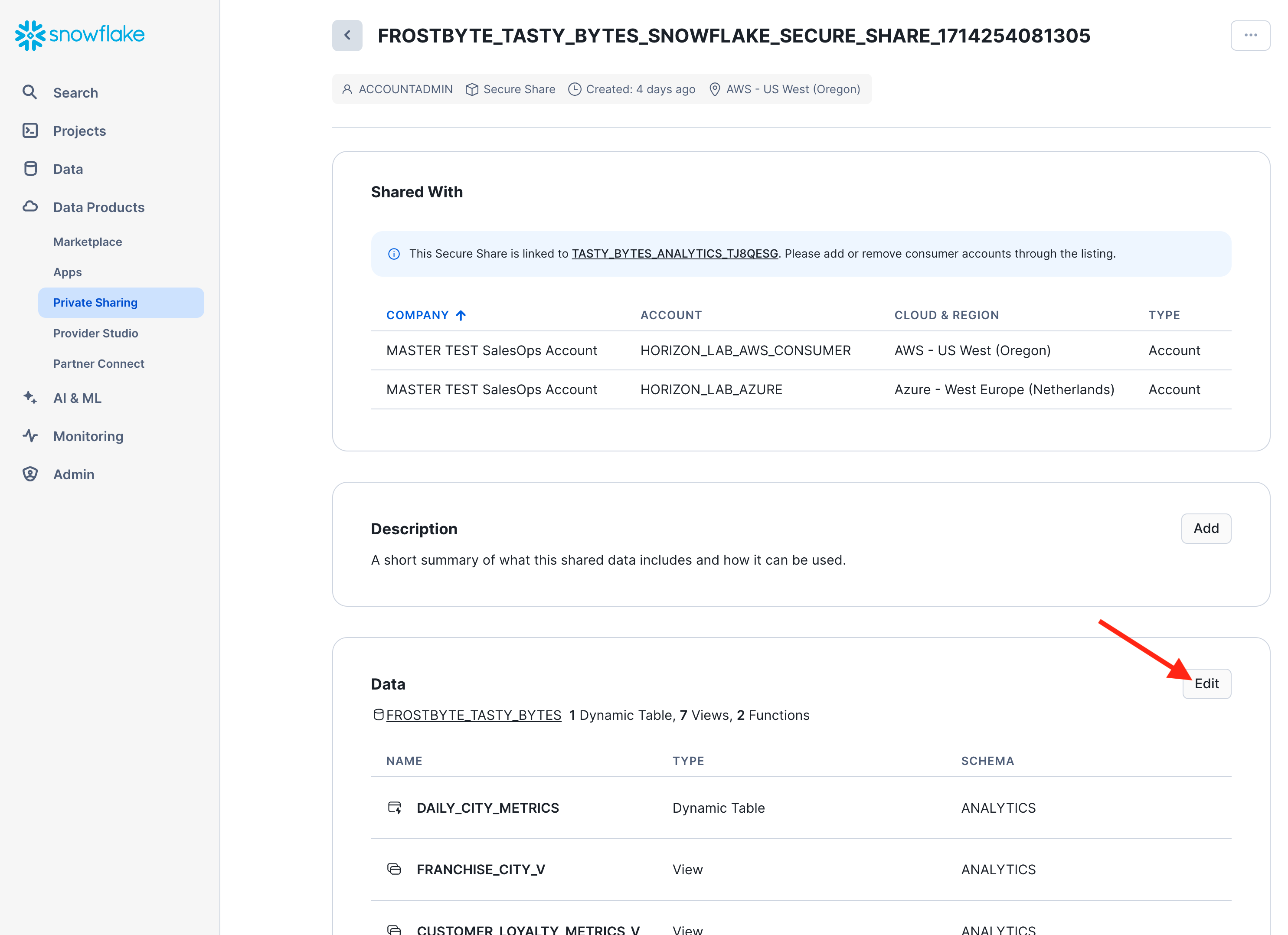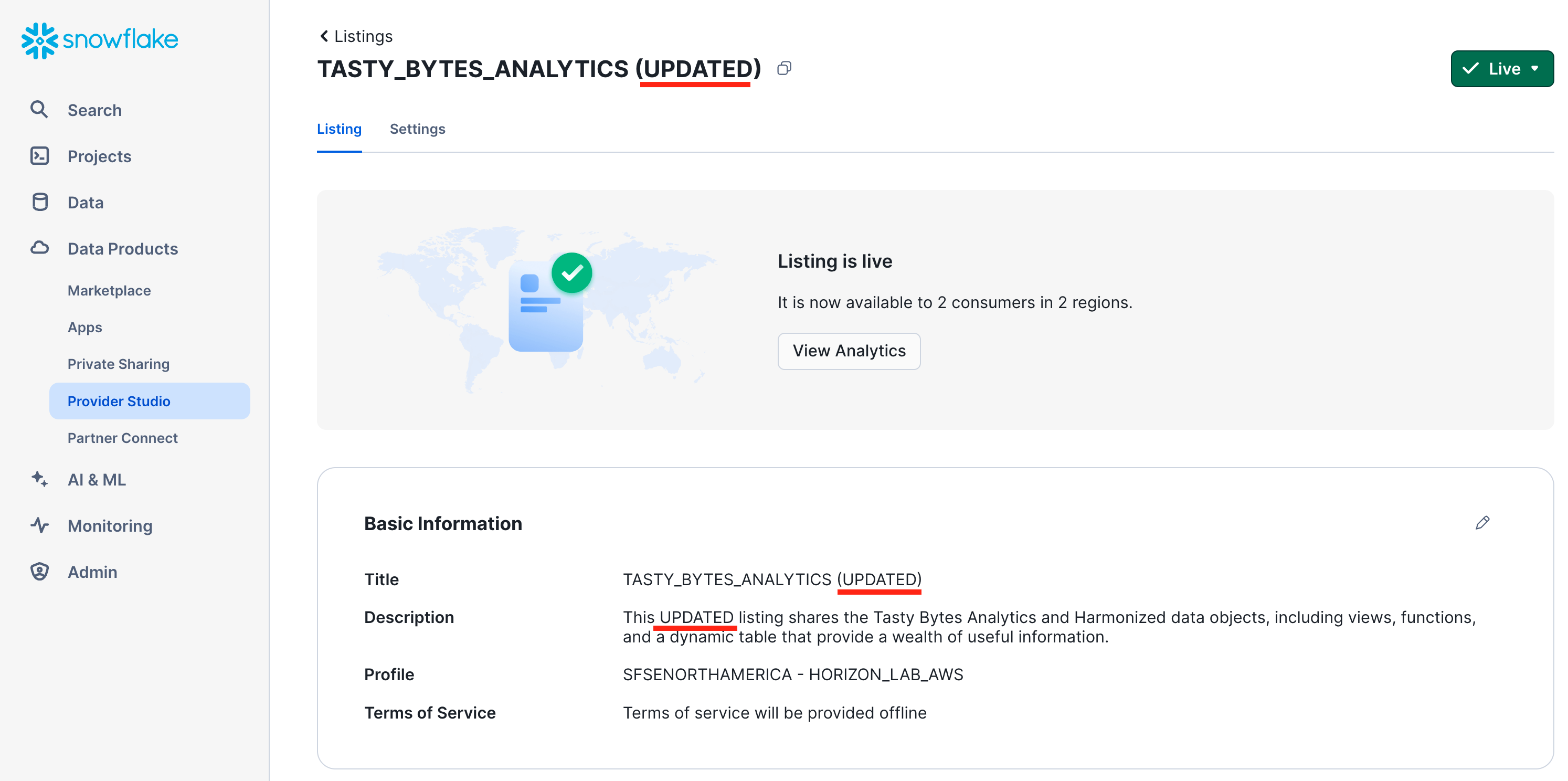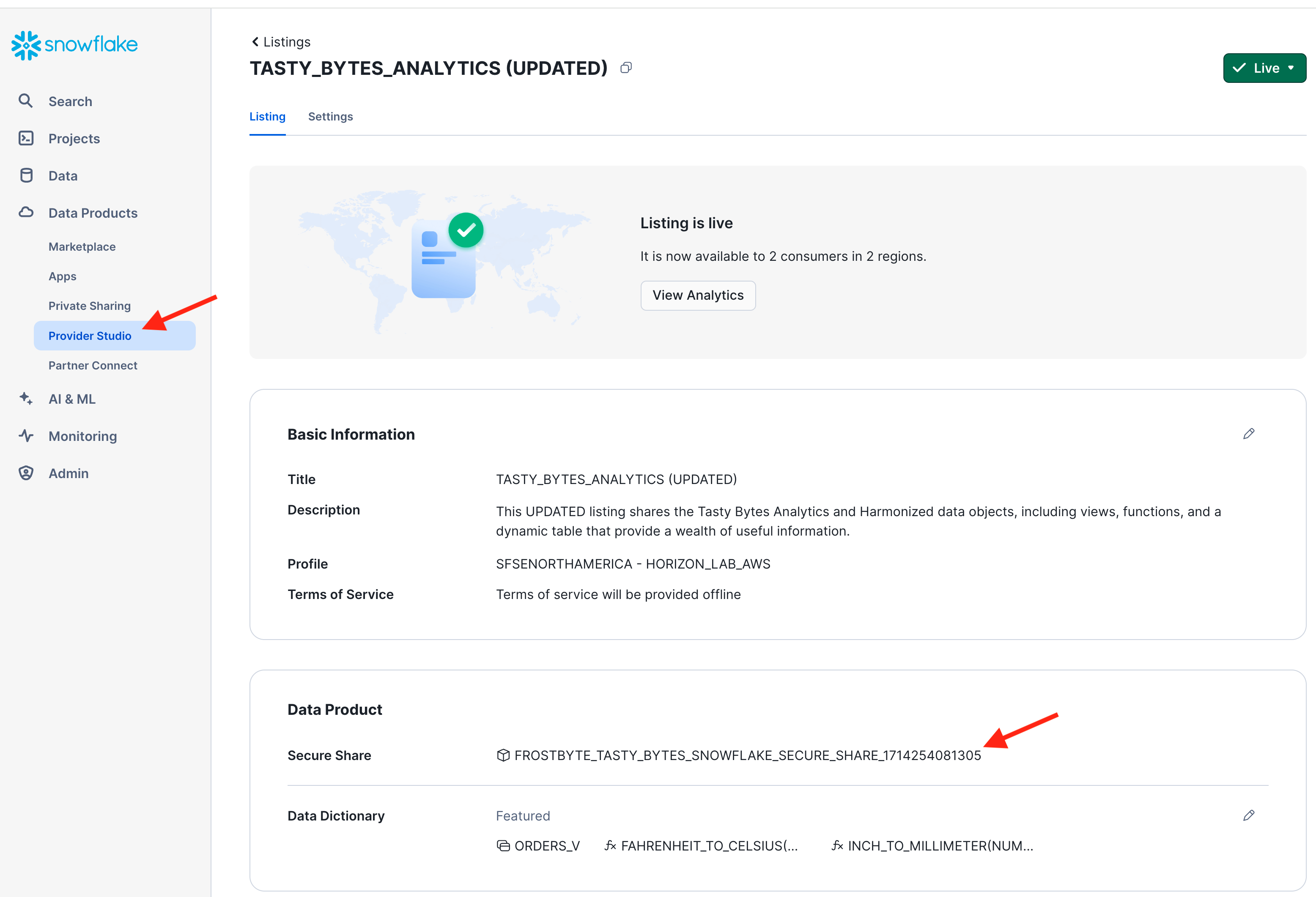 - For example: "This listing shares the Tasty Bytes Analytics and Harmonized data objects, including views, functions, and a dynamic table that provide a wealth of useful information."