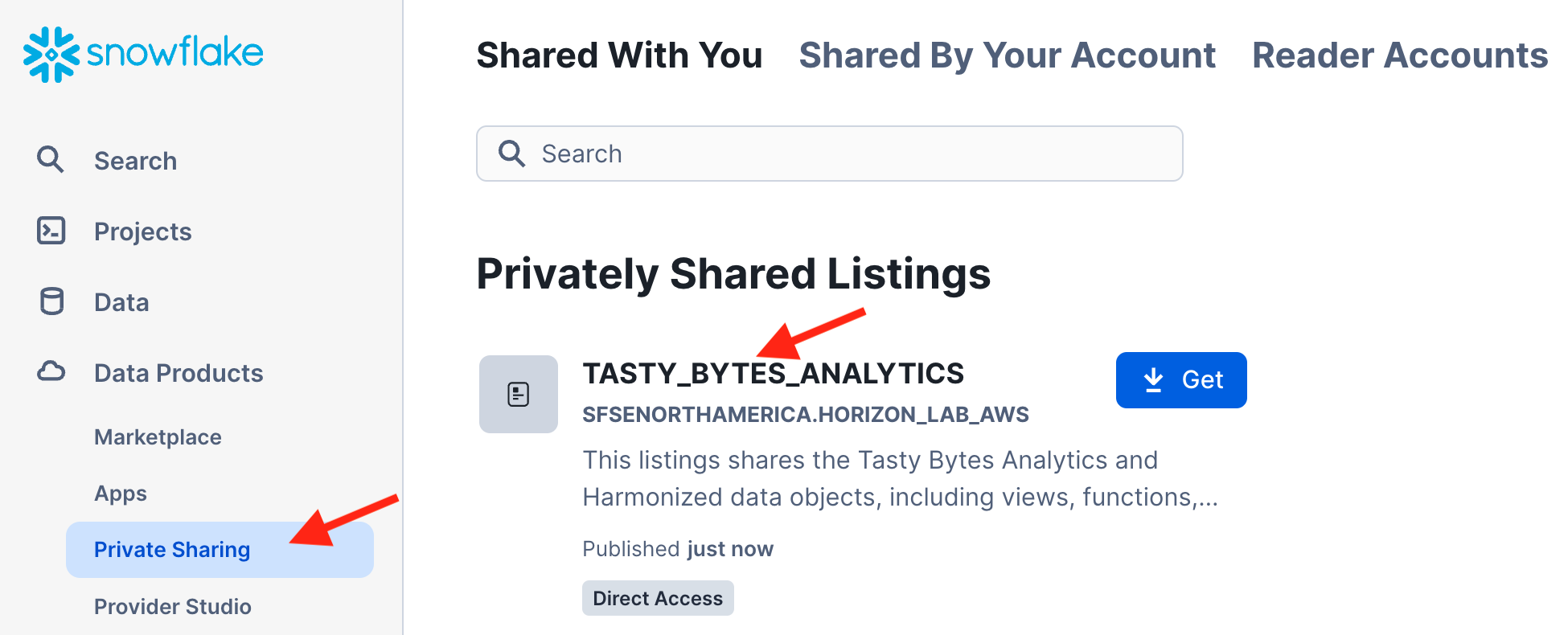 Navigate to Snowsight Data Products -> Private Sharing to acquire the Tasty Bytes Global Sales application: