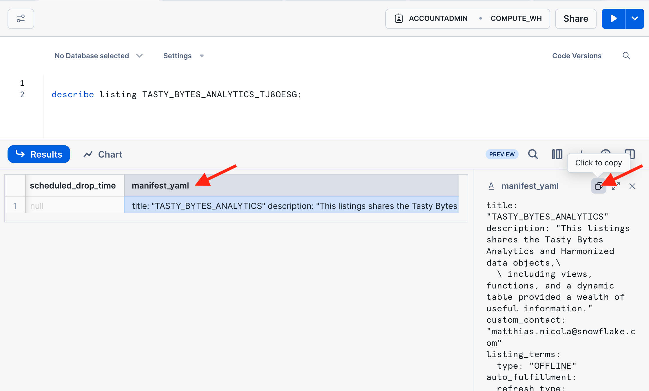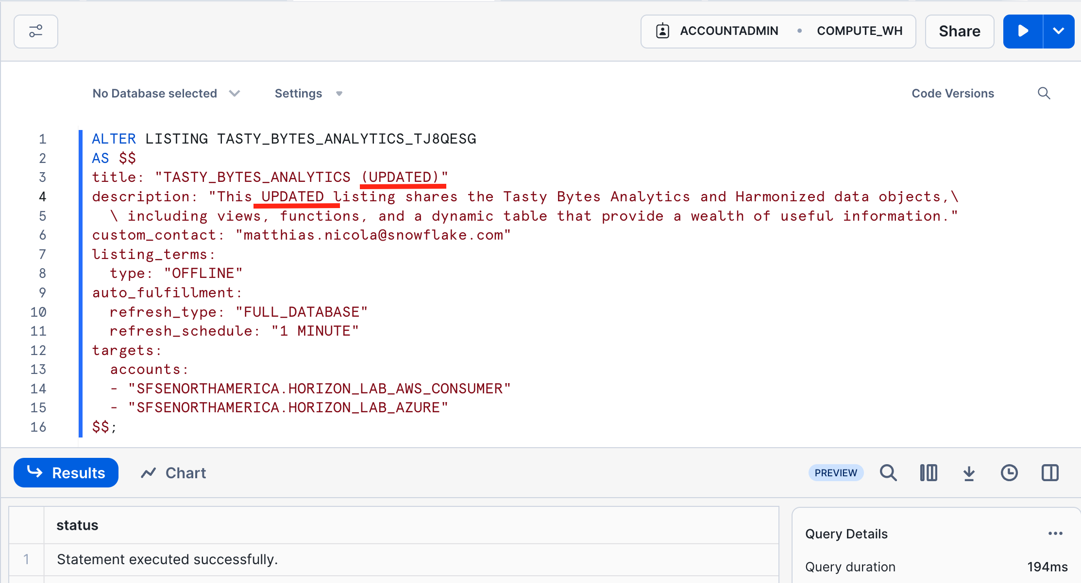 select current_organization_name() ||'.'|| current_account_name();- Further down in the same dialog, enter your email address to receive notifications about this listing.