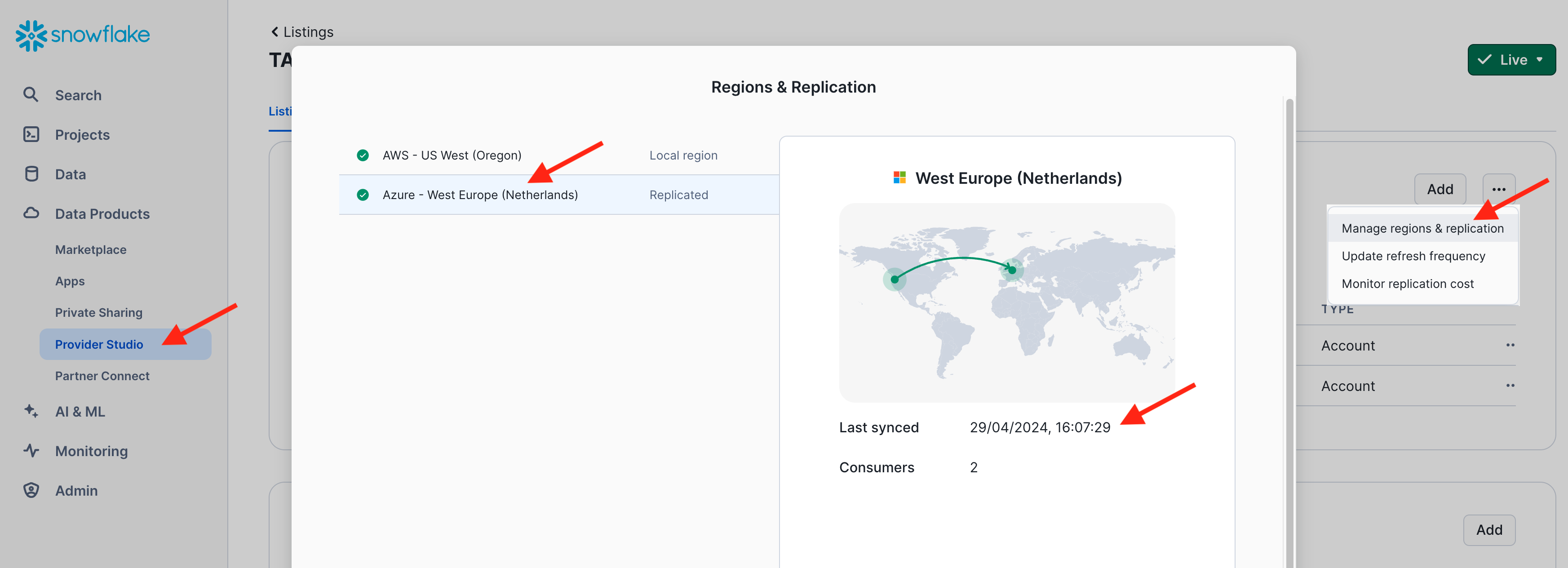 In your draft listing, navigate to the section "Consumer Accounts". Click the three dots on the right to update the refresh frequency of the replica that Snowflake will automatiucally create to share the data product with your Azure account.