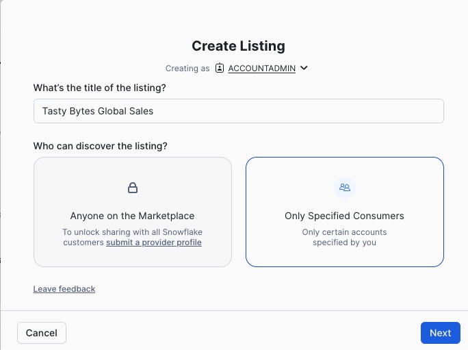Give your listing a meaningful title. Let's use TASTY_BYTES_ANALYTICS in this lab. Then select the option that "Only Specified Consumers" can discover the listing, and click "Next".