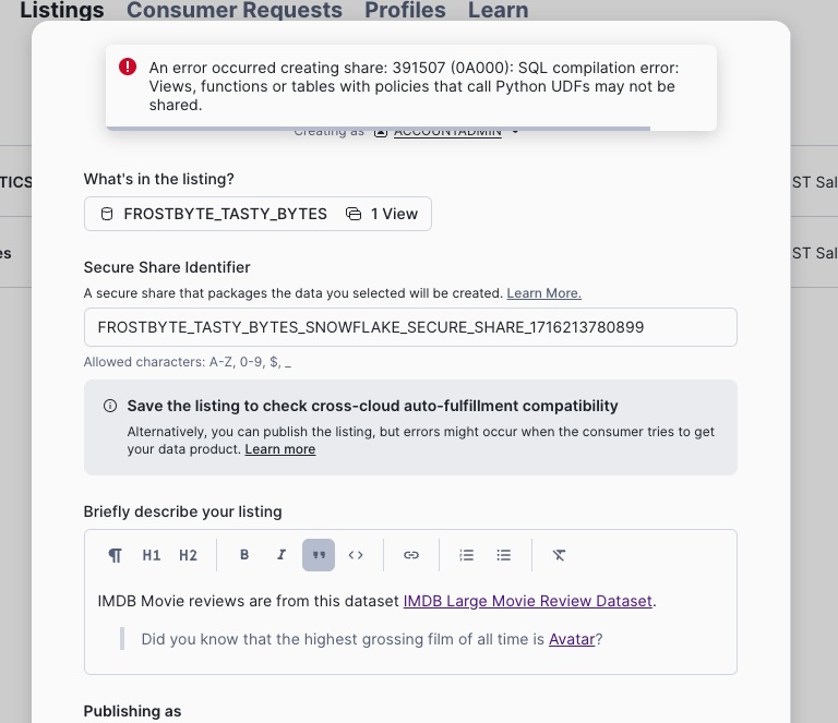 ICEBERG_LAB_ANALYTICS, attach iceberg tables and secure view. - In the Listing Description section: enter instructions on post-installation steps (see below)