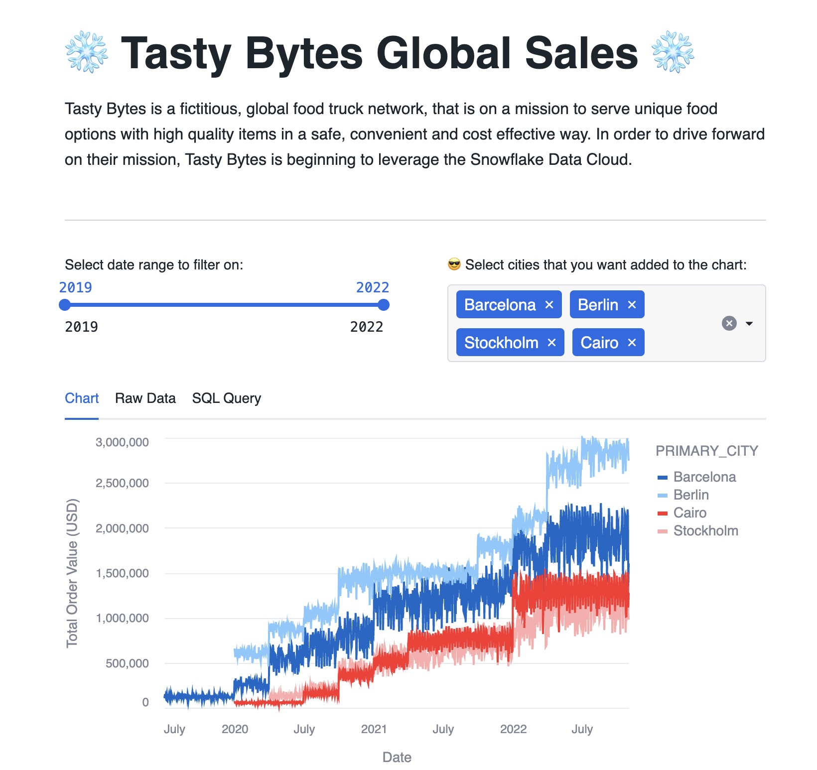 Tasty Bytes is a fictitious global food truck network that is on a mission to serve unique food options with high quality items in a safe, convenient and cost effective way. In order to drive forward on their mission, Tasty Bytes is beginning to leverage the Snowflake Data Cloud.