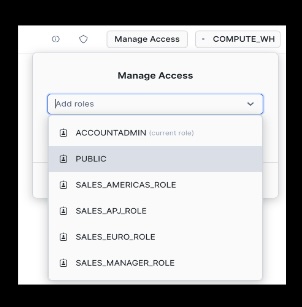 USE ROLE accountadmin; SET my_user_var = CURRENT_USER(); ALTER USER identifier($my_user_var) SET DEFAULT_ROLE = accountadmin; CREATE OR REPLACE WAREHOUSE compute_wh WAREHOUSE_SIZE=medium INITIALLY_SUSPENDED=TRUE; GRANT ALL ON WAREHOUSE compute_wh TO ROLE public; CREATE DATABASE IF NOT EXISTS snowflake_sample_data FROM SHARE sfc_samples.sample_data; GRANT IMPORTED PRIVILEGES ON DATABASE snowflake_sample_data TO public; USE ROLE useradmin; CREATE OR REPLACE ROLE sales_emea_role COMMENT = 'EMEA Sales role for Tasty Bytes'; CREATE OR REPLACE ROLE sales_americas_role COMMENT = 'Americas Sales role for Tasty Bytes'; CREATE OR REPLACE ROLE sales_apj_role COMMENT = 'APJ Sales role for Tasty Bytes'; CREATE OR REPLACE ROLE sales_manager_role COMMENT = 'Sales Manager (all-access) role for Tasty Bytes'; -- grant all these roles to the login user GRANT ROLE sales_emea_role TO USER identifier($my_user_var); GRANT ROLE sales_americas_role TO USER identifier($my_user_var); GRANT ROLE sales_apj_role TO USER identifier($my_user_var); GRANT ROLE sales_manager_role TO USER identifier($my_user_var); SHOW ROLES;