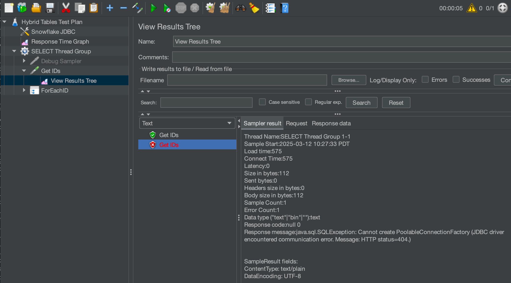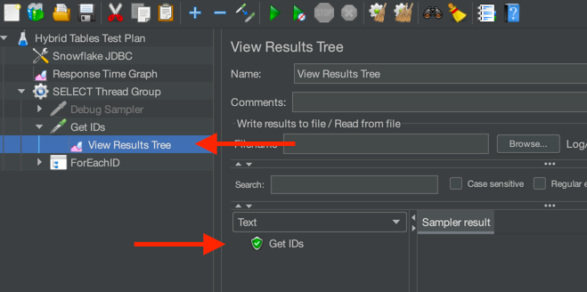 With just a single thread and a few records, let's check that JMeter is connecting to Snowflake. In the