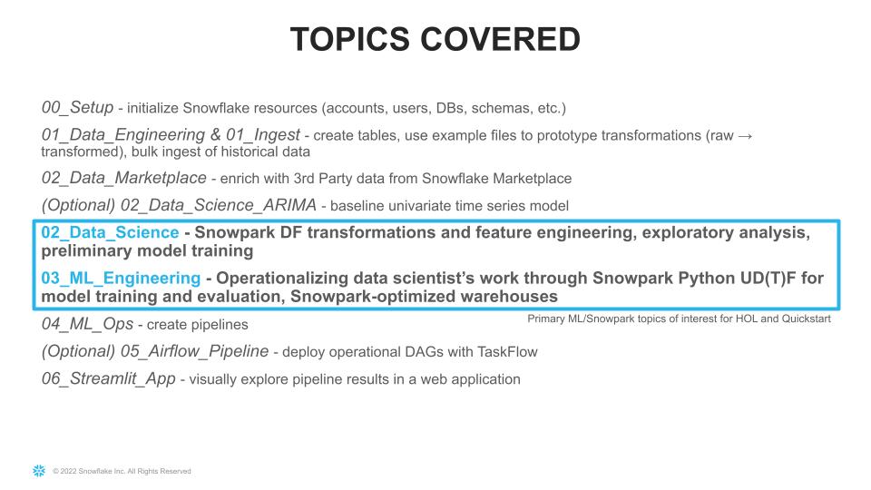 In this quickstart we demonstrated how Snowpark Python enables rapid, end-to-end machine learning workload development, deployment, and orchestration.
