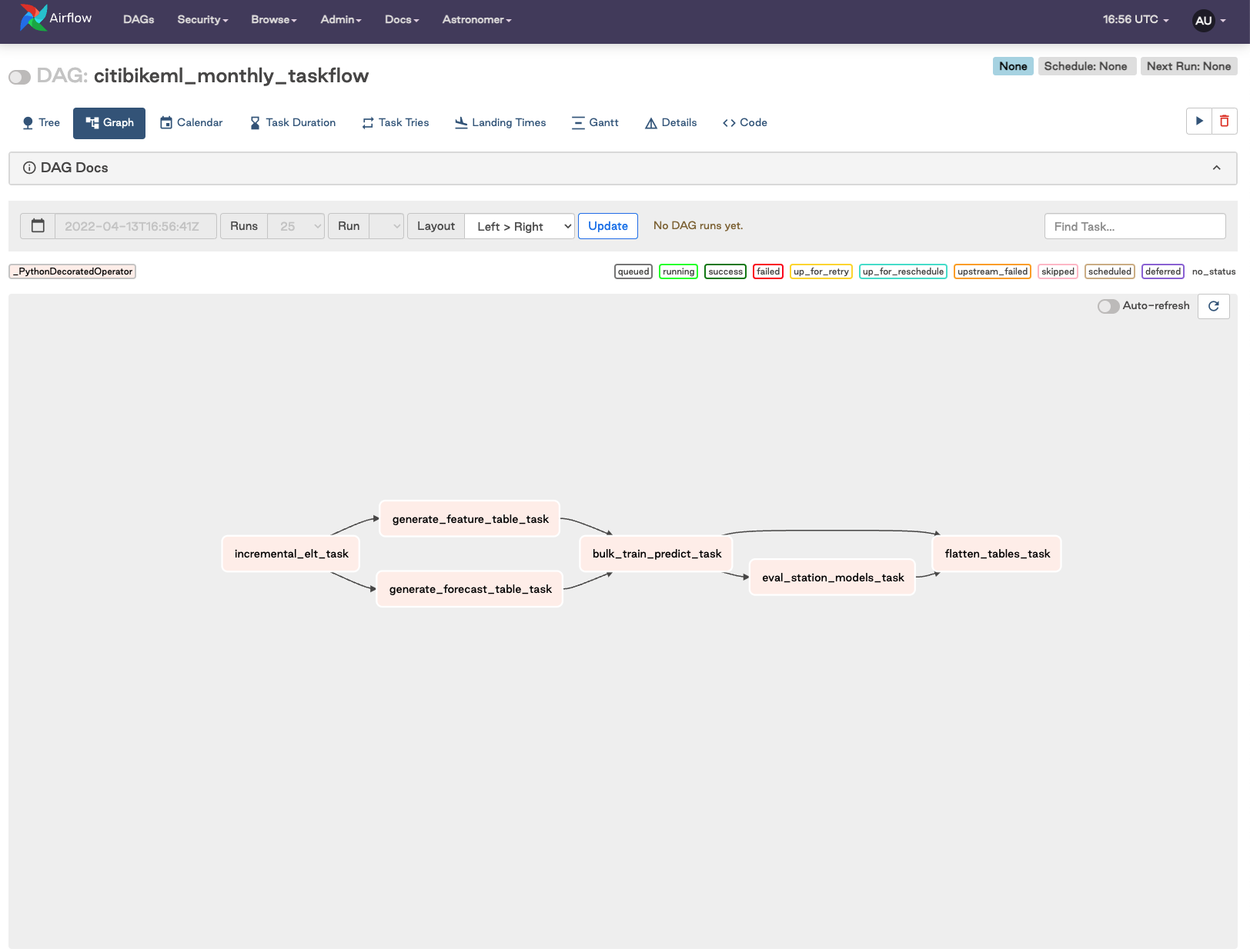 What You'll Do: Now that we have created Python code that is meant to support operational deployments of our model training and inference tasks, we need to wrap these functions as Airflow tasks for easy orchestration. Note: this section requires Docker Desktop to run.