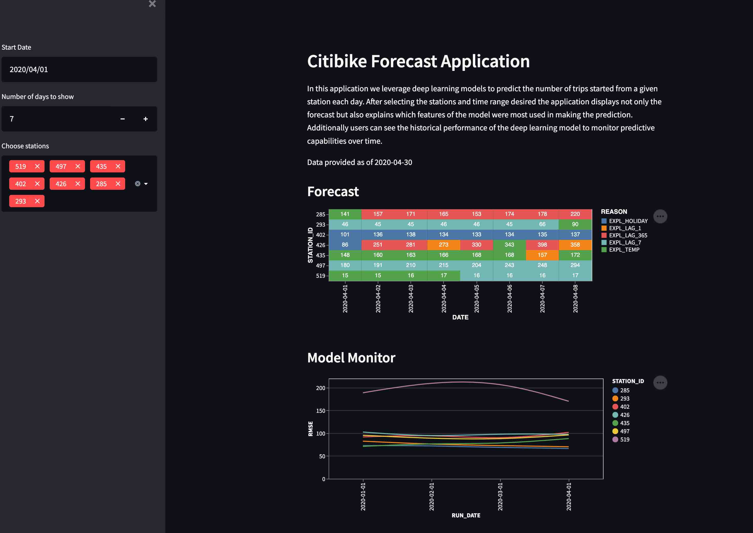 To ensure customer satisfaction Citibike needs to predict how many bicycles will be needed at each station. Maintenance teams from Citibike will check each station and repair or replace bicycles. Additionally, the team will relocate bicycles between stations based on predicted demand. The operations team needs an application to show how many bicycles will be needed at a given station on a given day.
