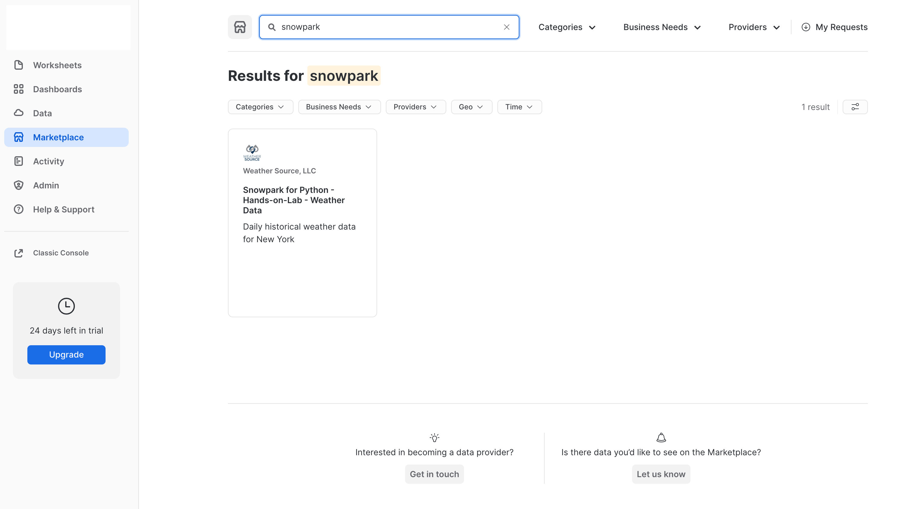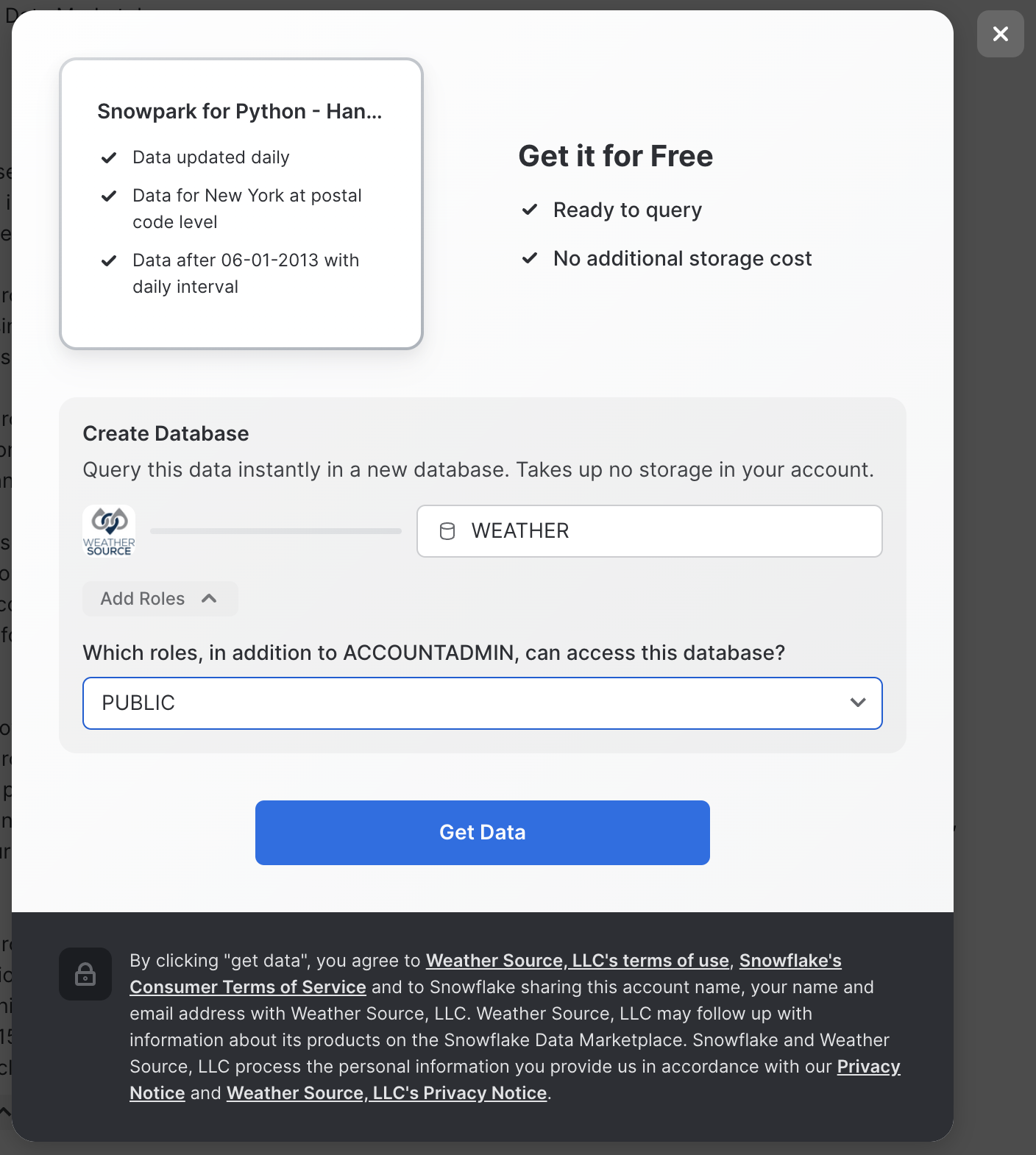 Open up the 02_Data_Marketplace notebook and follow the instructions to add the Snowpark Hands-on-Lab Weather Source dataset to your Snowflake account.