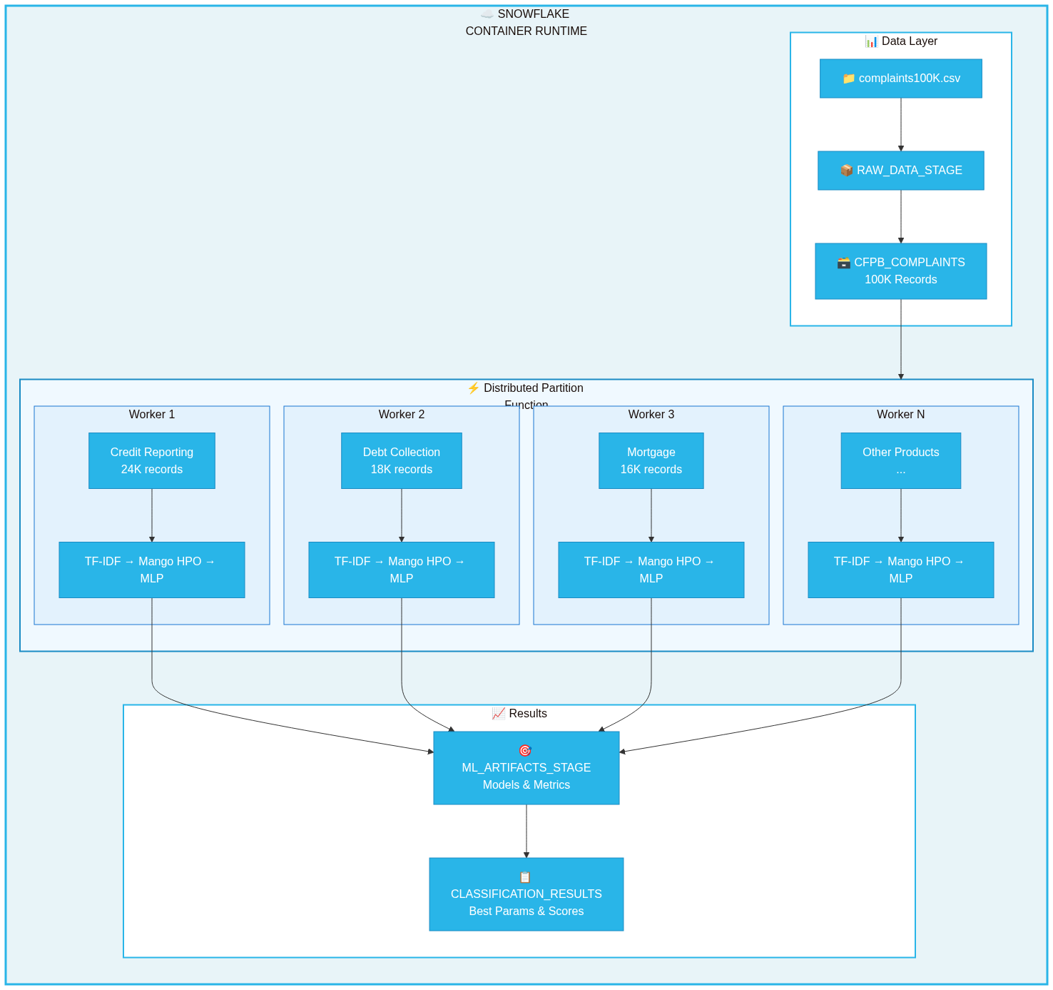 ┌─────────────────────────────────────────────────────────────────────────────┐ │ SNOWFLAKE CONTAINER RUNTIME │ ├─────────────────────────────────────────────────────────────────────────────┤ │ ┌─────────────┐ ┌─────────────────────────────────────────────────┐ │ │ │ CFPB │ │ DISTRIBUTED PARTITION FUNCTION │ │ │ │ Complaints │───▶│ ┌─────────┐ ┌─────────┐ ┌─────────┐ ┌─────────┐│ │ │ │ Table │ │ │Product 1│ │Product 2│ │Product 3│ │Product N││ │ │ └─────────────┘ │ │ Worker │ │ Worker │ │ Worker │ │ Worker ││ │ │ │ │ │ │ │ │ │ │ ││ │ │ │ │TF-IDF + │ │TF-IDF + │ │TF-IDF + │ │TF-IDF + ││ │ │ │ │Mango HPO│ │Mango HPO│ │Mango HPO│ │Mango HPO││ │ │ │ │ + MLP │ │ + MLP │ │ + MLP │ │ + MLP ││ │ │ │ └────┬────┘ └────┬────┘ └────┬────┘ └────┬────┘│ │ │ └───────┼───────────┼───────────┼───────────┼─────┘ │ │ │ │ │ │ │ │ ▼ ▼ ▼ ▼ │ │ ┌─────────────────────────────────────────────────┐ │ │ │ ML_ARTIFACTS_STAGE │ │ │ │ (Models, Metrics, Best Hyperparameters) │ │ │ └─────────────────────────────────────────────────┘ │ └─────────────────────────────────────────────────────────────────────────────┘