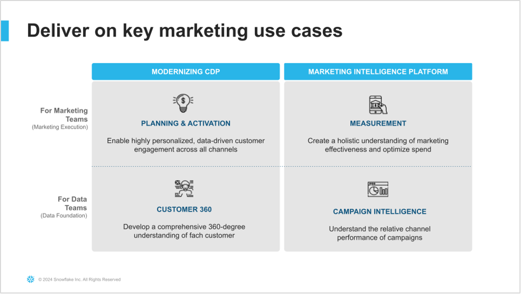 Additionally, the industry is shifting towards first-party data ownership, a move propelled by the deprecation of third-party cookies. This shift is essential for maintaining direct customer relationships and adapting to changing privacy norms. The promise of generative AI and the understanding that an effective AI strategy requires a robust data strategy have spurred efforts to centralize marketing data within Snowflake. Organizations aim to organize data into standard schemas that Large Language Models (LLMs) can understand, employing these models in innovative ways to personalize content and predict customer behavior.