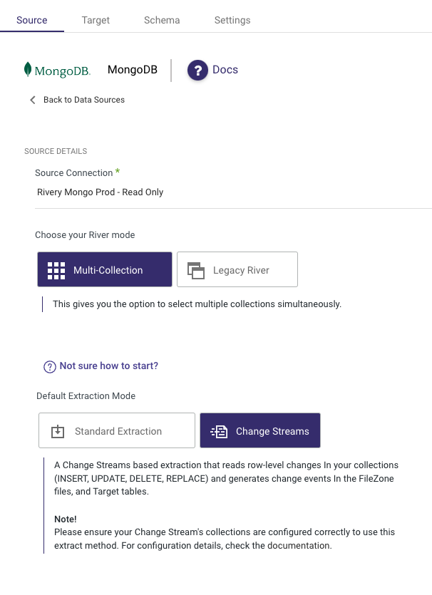 You can also add additional configurations like options to run ‘Multi-Collection’ (Multi Table) or ‘Legacy River’ (Single Table). You’ll want to then select ‘Change Streams’ as your Default Extraction Mode.