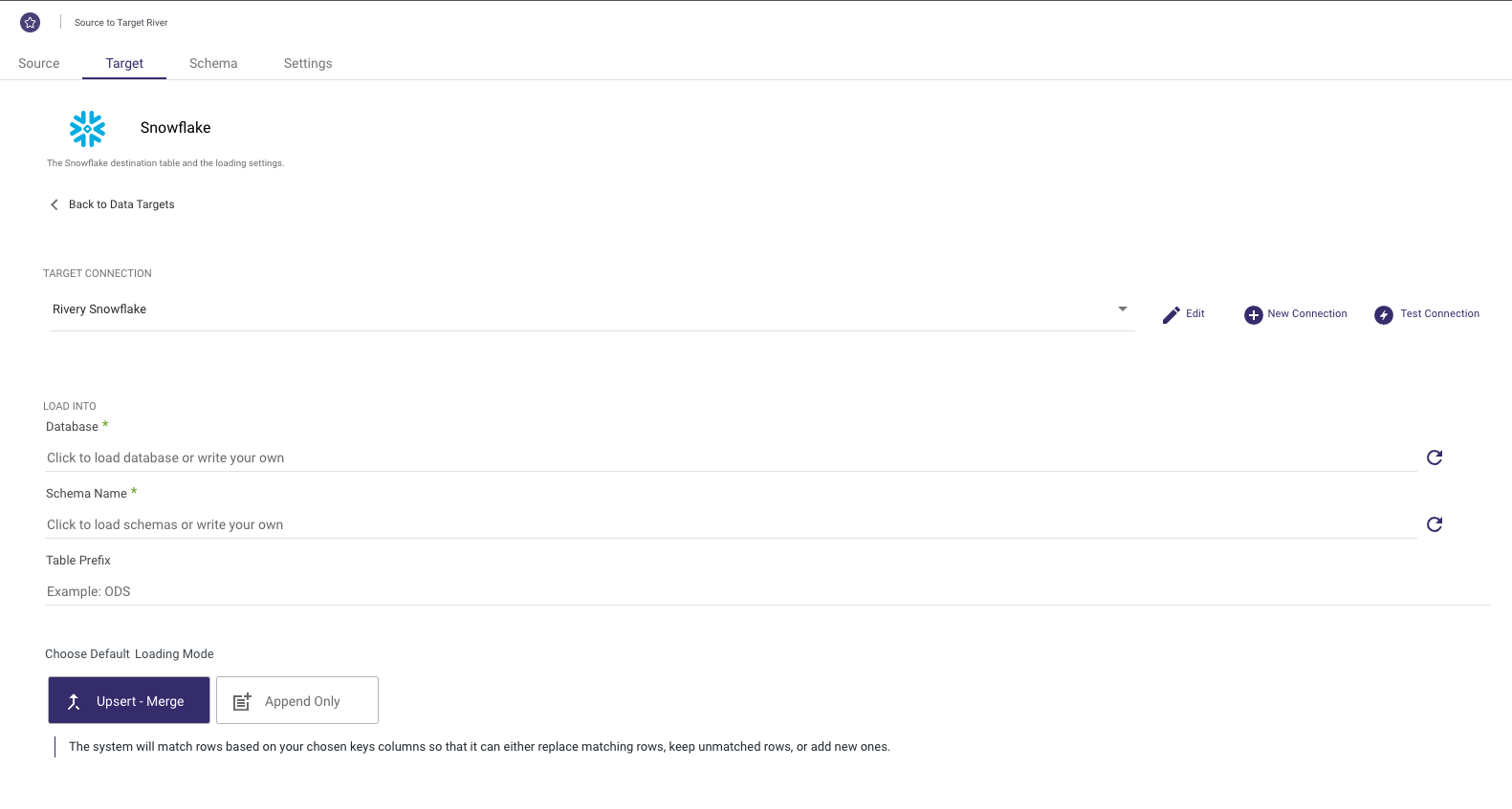 Rivery supports loading your data via 3 different modes including Upsert-Merge, Append, and Overwrite.
