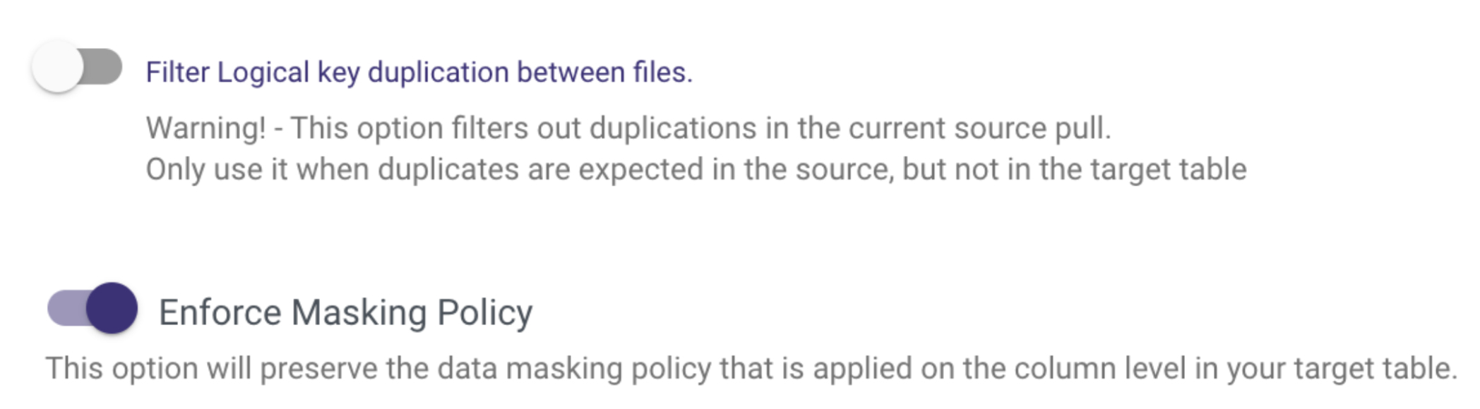 Specifically, under the Table Settings tab, you will find Advanced Options to filter logical key duplication and enforce a masking policy if you want to respect a data masking policy already defined in Snowflake.