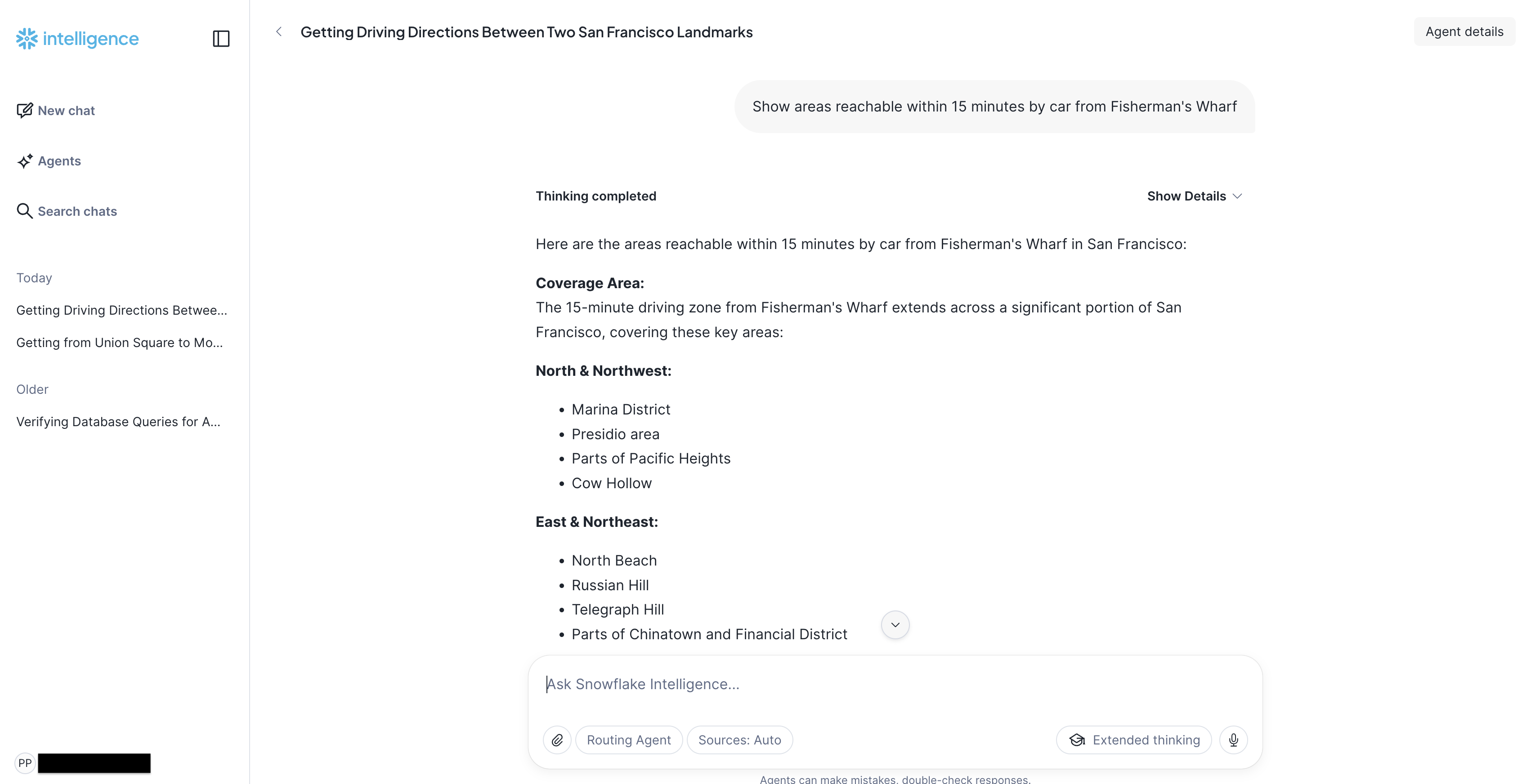 This quickstart deploys a Snowflake Intelligence Agent that wraps OpenRouteService routing functions with AI-powered geocoding. Users can ask questions like "Get directions from Union Square San Francisco to Golden Gate Bridge" and the agent automatically converts location names to coordinates, calls the routing functions, and returns formatted results.