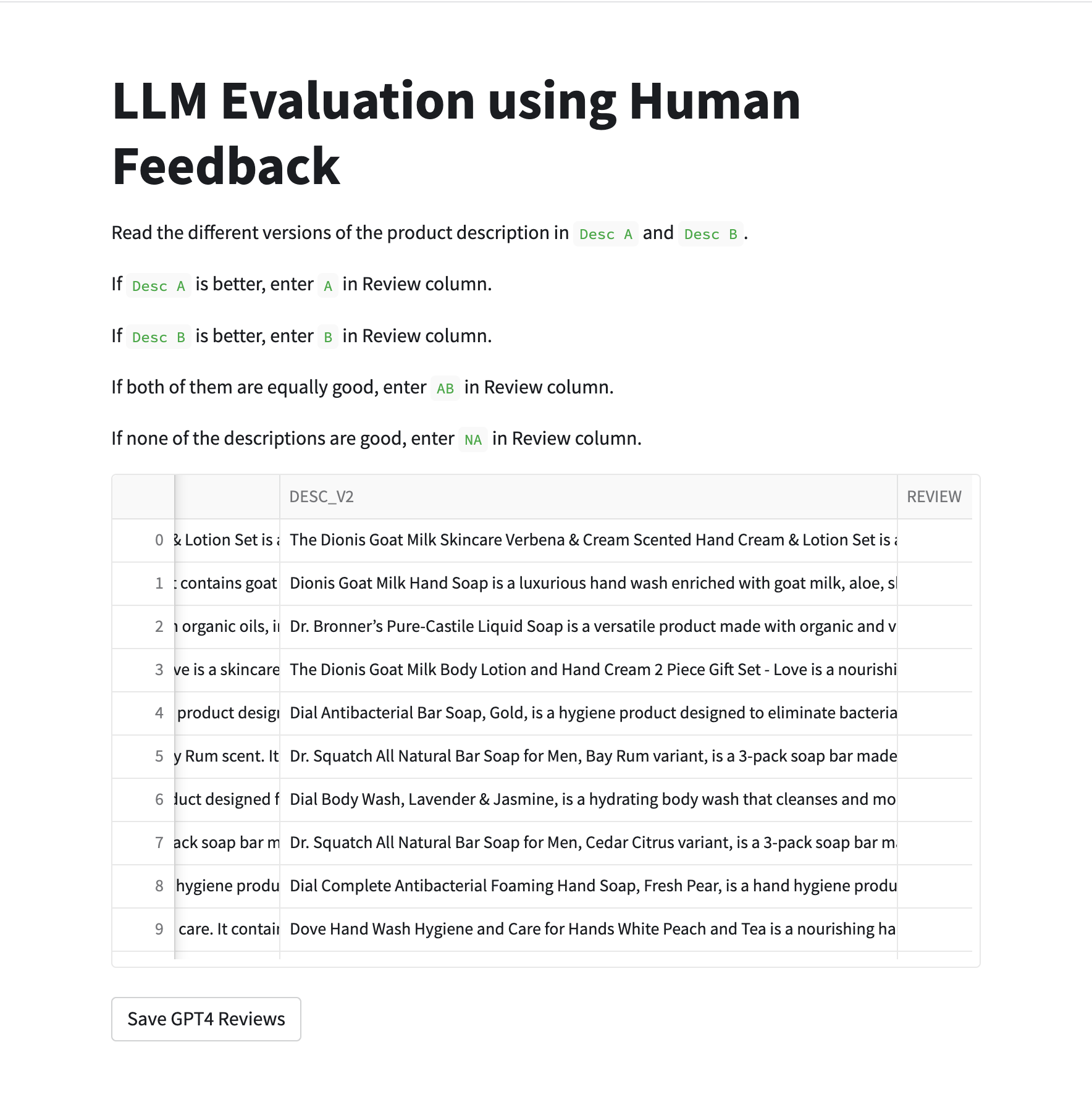 Step 8. In the Streamlit application, you can see the product name along with two different model responses. You can click on the description to read the entire text and write your feedback in the review column.
