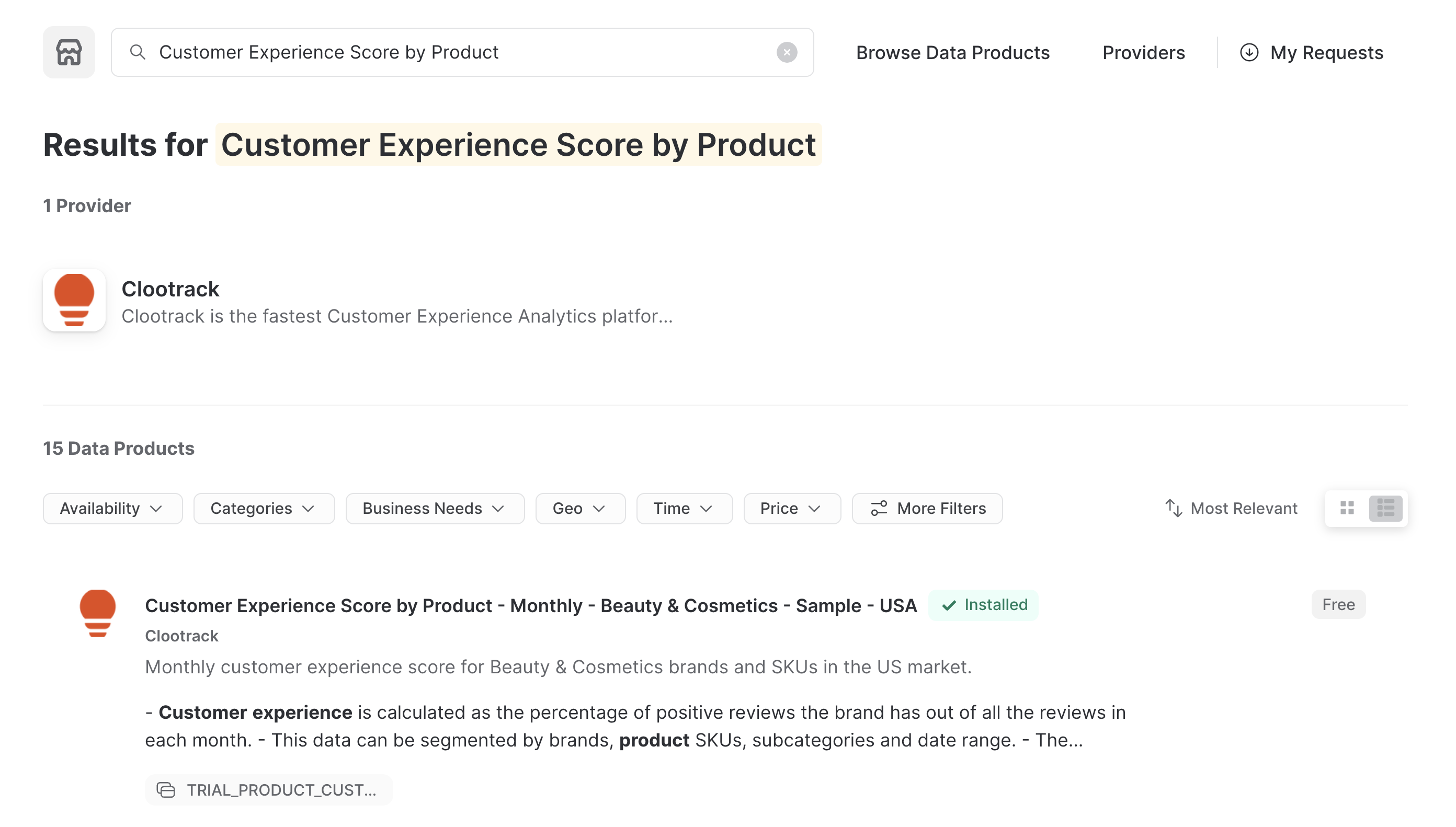 During this step, we will be loading customer experience data to Snowflake. But "loading" is really the wrong word here. Because we're using Snowflake's unique data sharing capability we don't actually need to copy the data to our Snowflake account with a custom ETL process. Instead we can directly access the customer review data shared by Clootrack in the Snowflake Marketplace.