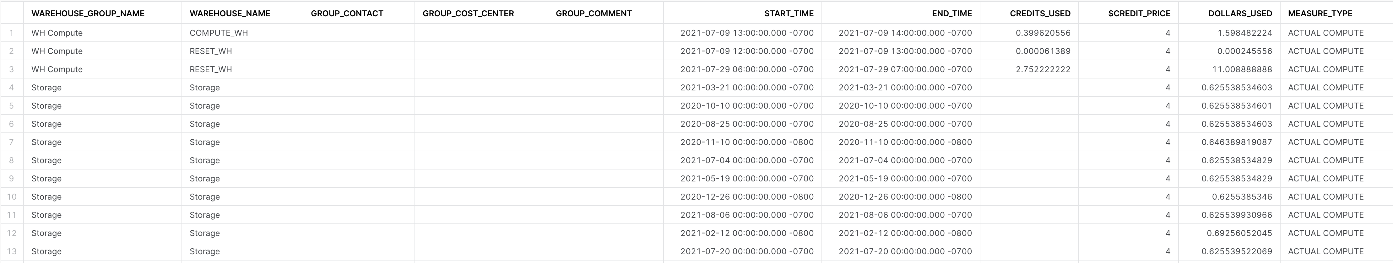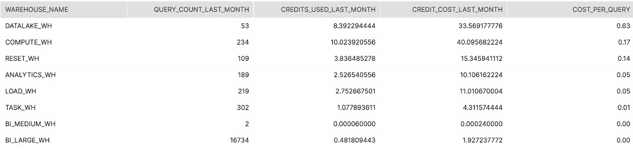 set credit_price = 4; --edit this value to reflect your credit price SELECT COALESCE(WC.WAREHOUSE_NAME,QC.WAREHOUSE_NAME) AS WAREHOUSE_NAME ,QC.QUERY_COUNT_LAST_MONTH ,WC.CREDITS_USED_LAST_MONTH ,WC.CREDIT_COST_LAST_MONTH ,CAST((WC.CREDIT_COST_LAST_MONTH / QC.QUERY_COUNT_LAST_MONTH) AS decimal(10,2) ) AS COST_PER_QUERY FROM ( SELECT WAREHOUSE_NAME ,COUNT(QUERY_ID) as QUERY_COUNT_LAST_MONTH FROM SNOWFLAKE.ACCOUNT_USAGE.QUERY_HISTORY WHERE TO_DATE(START_TIME) >= TO_DATE(DATEADD(month,-1,CURRENT_TIMESTAMP())) GROUP BY WAREHOUSE_NAME ) QC JOIN ( SELECT WAREHOUSE_NAME ,SUM(CREDITS_USED) as CREDITS_USED_LAST_MONTH ,SUM(CREDITS_USED)*($CREDIT_PRICE) as CREDIT_COST_LAST_MONTH FROM SNOWFLAKE.ACCOUNT_USAGE.WAREHOUSE_METERING_HISTORY WHERE TO_DATE(START_TIME) >= TO_DATE(DATEADD(month,-1,CURRENT_TIMESTAMP())) GROUP BY WAREHOUSE_NAME ) WC ON WC.WAREHOUSE_NAME = QC.WAREHOUSE_NAME ORDER BY COST_PER_QUERY DESC ;