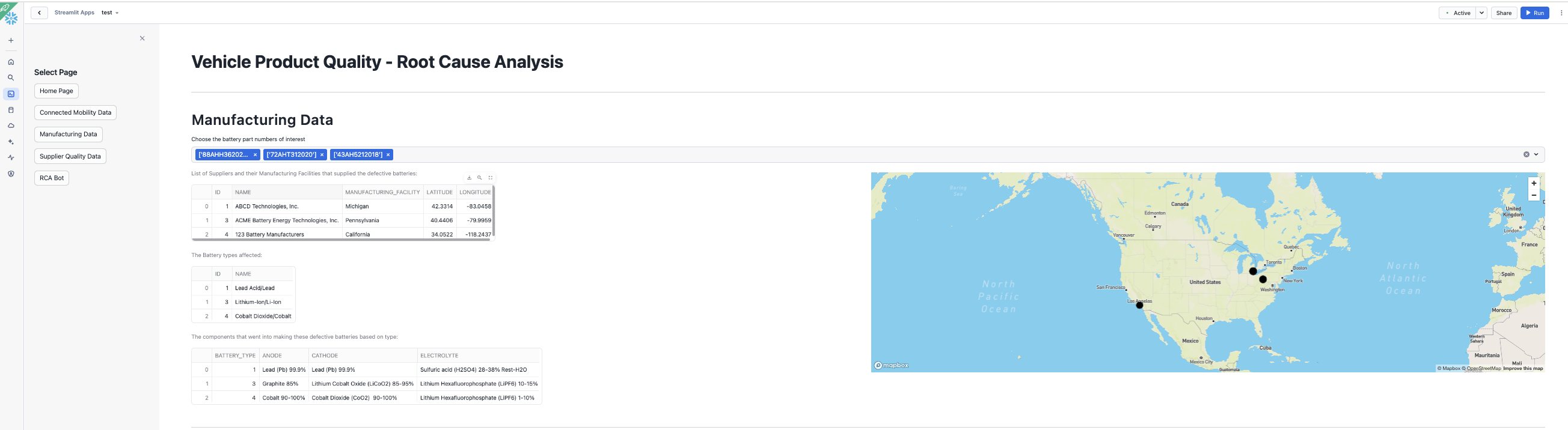 This page serves to display and analyze manufacturing data related to vehicle battery parts. This page provides insights into the suppliers, manufacturing facilities, battery types, and components involved in the production process. Let's break down its functionality: