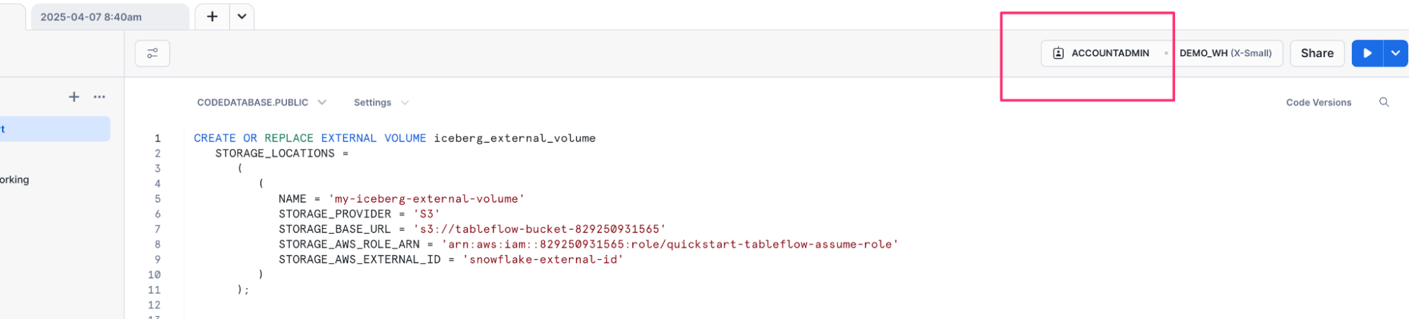 - Execute the following command, ensuring that all variables match exactly. If you named your external volume, catalog or kafka topic something different, this query will not work: