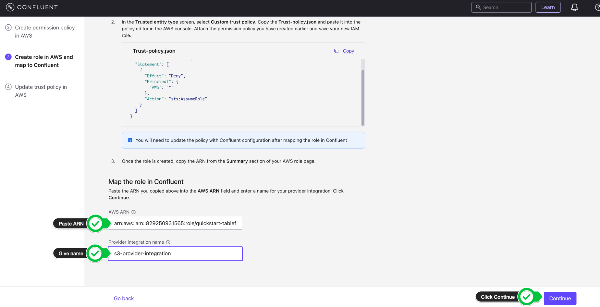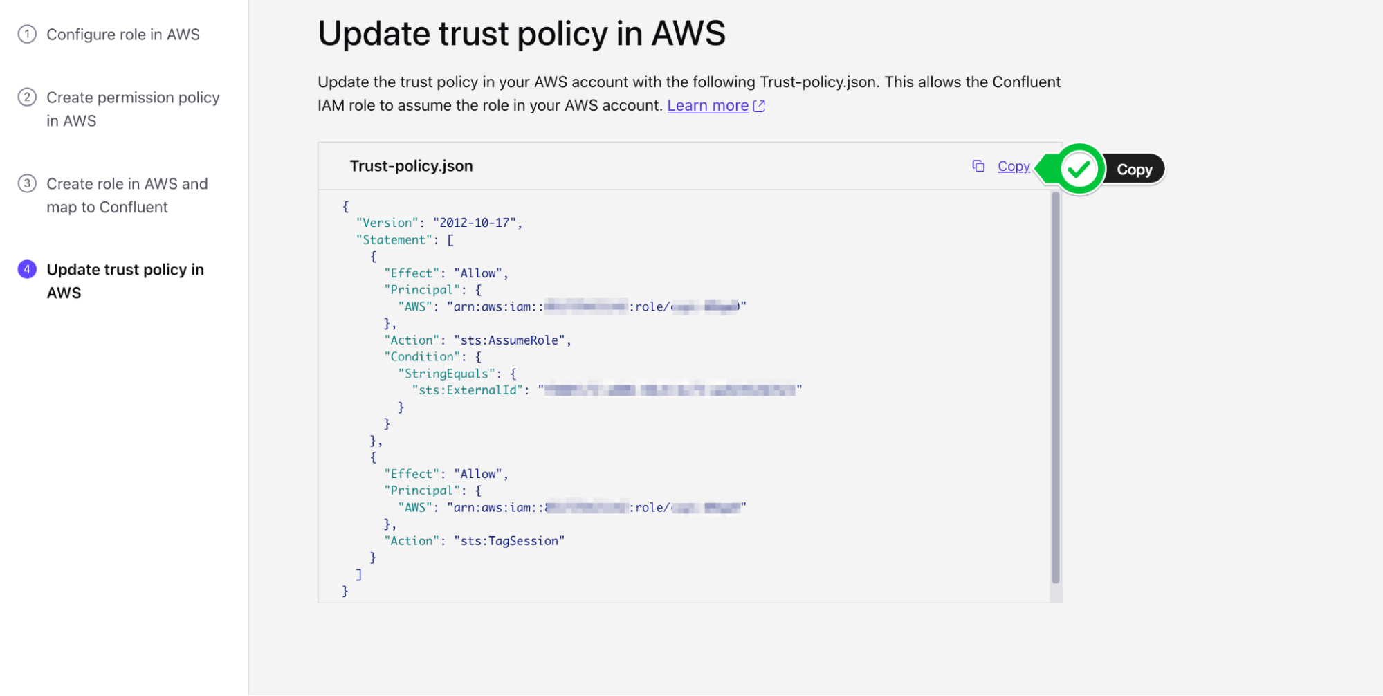 - How to configure secure access between AWS, Confluent, and Snowflake using IAM roles and trust policies.