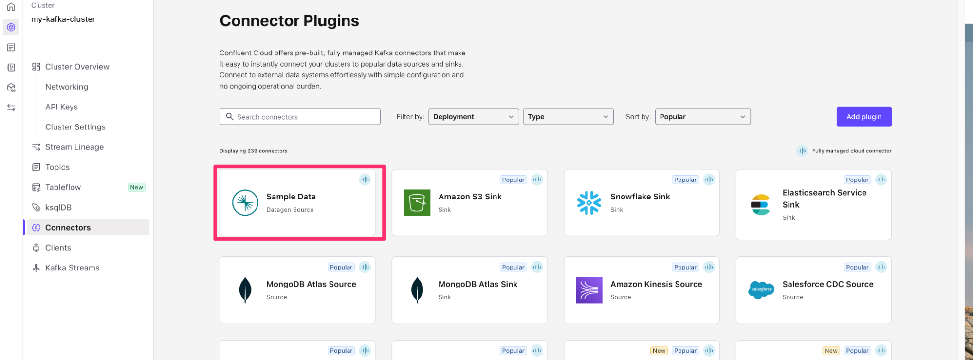 On the Cluster Overview screen, you will see Connectors on the left hand screen. Click on Connectors and then search for Datagen Source or click the datagen source, it is usually one of the first connectors on the page.