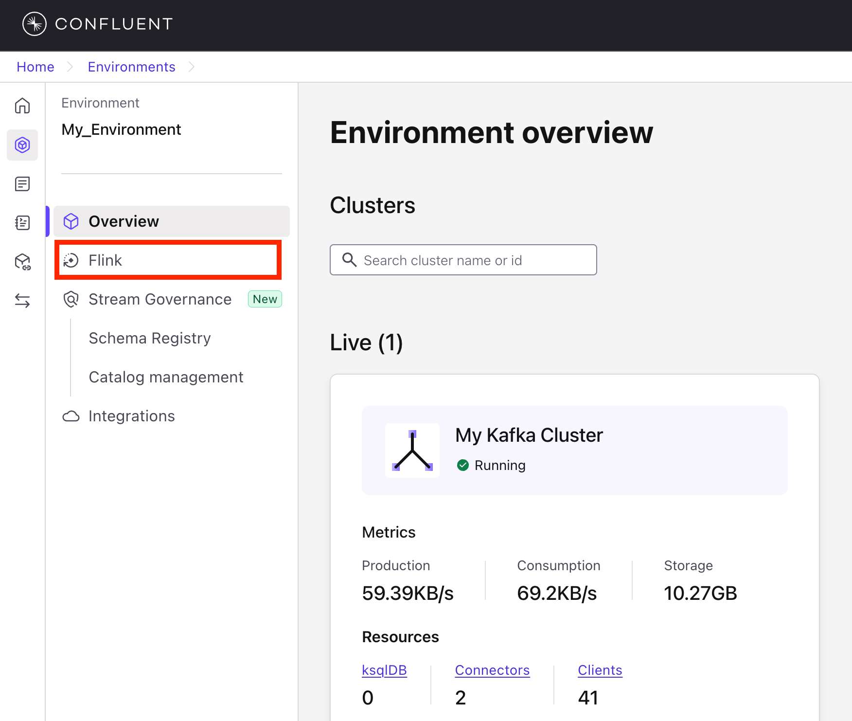 From the Confluent Cloud console, navigate to your environment either via the left-hand side portal or in the middle of the page under Your resource overview.