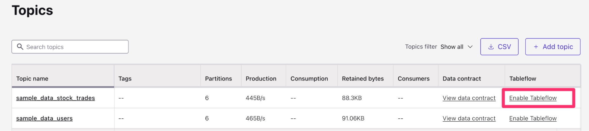 Once you have your Kafka topics created, you can now get started with Tableflow to sync your data from your Kafka topics into Snowflake Data Cloud.
