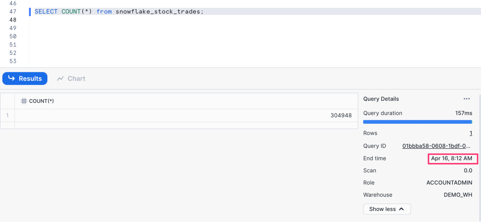 -- count the number of records SELECT COUNT(*) from snowflake_stock_trades; -- see one record in the table select * from snowflake_stock_trades limit 1; -- see all records in the table SELECT * FROM snowflake_stock_trades;